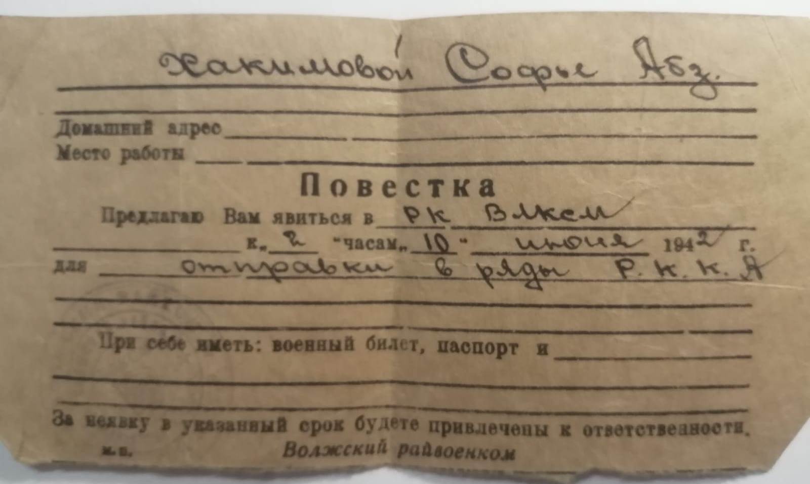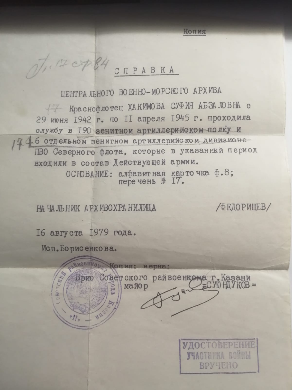София (Суфия) Абзаловна (Азалова) Хакимова родилась в 1919 г. (1918 г.) в д.Кутлушкино, Чистопольского района, ТАССР. 29 июня 1942 г. призвана в ряды Красной Армии Волжским районным военным комиссариатом, Марийской АССР. Службу проходила в 190 зенитном артиллерийском полку 1776 отдельном зенитном артиллерийском дивизионе ПВО Северного флота. Демобилизована 11.04.1945 г. Награждена орденом Отечественной войны II степени (23.12.1985).