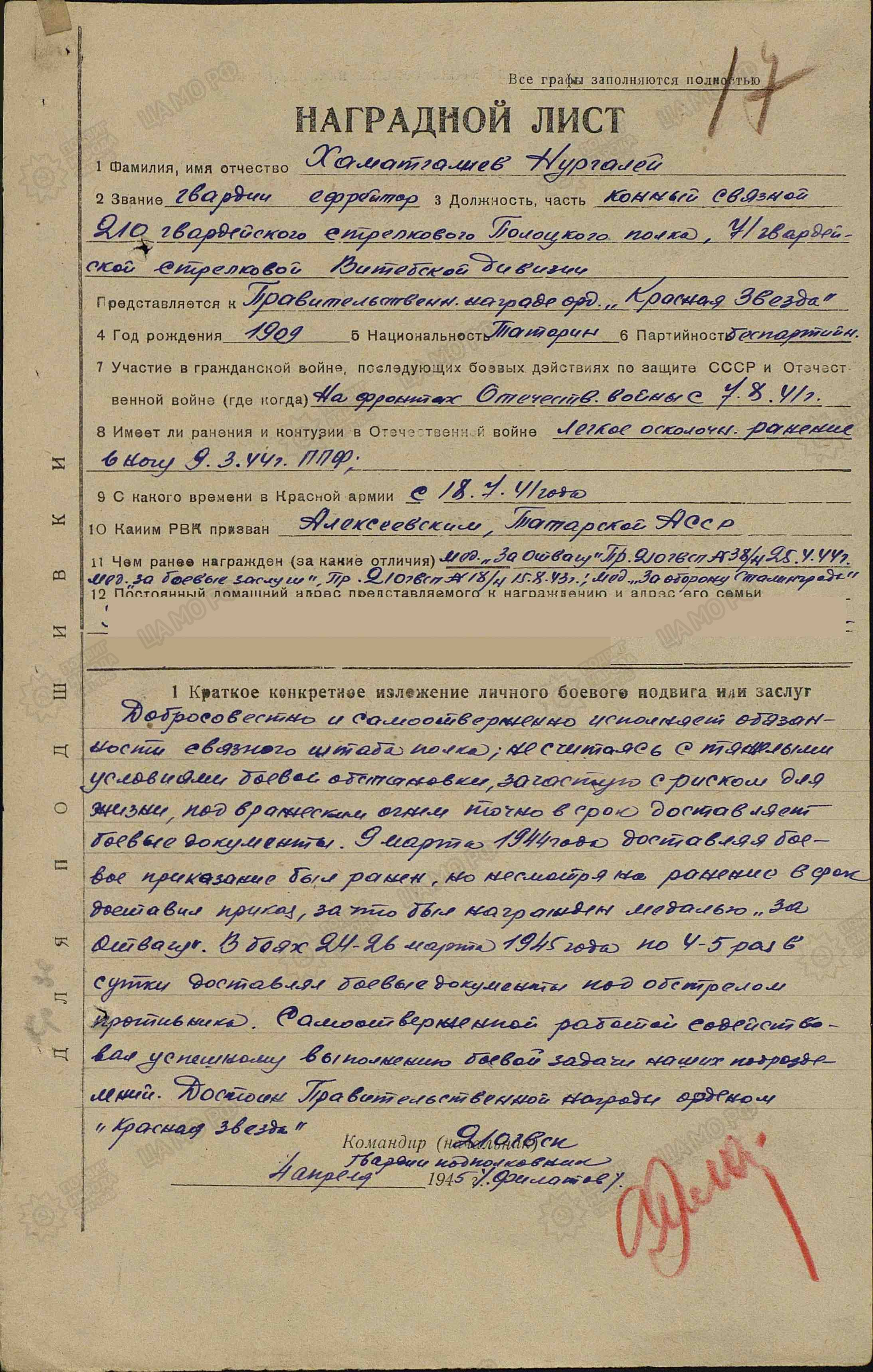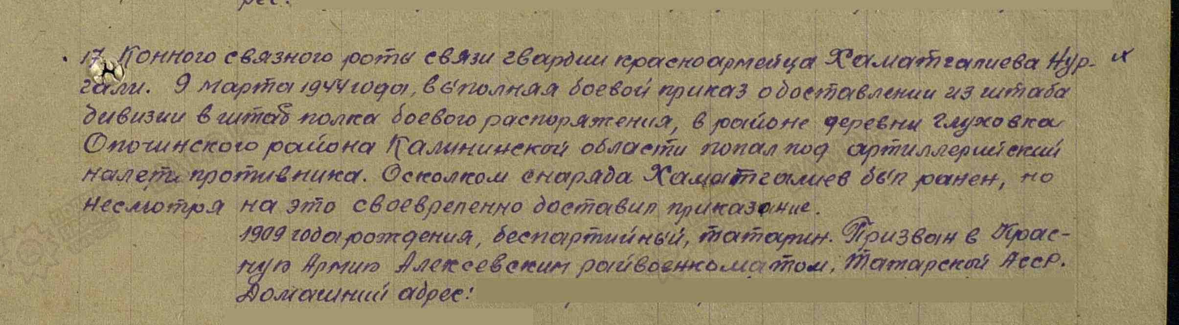 ХАМАТГАЛИЕВ Нургали Хаматгалиевич, 1909, с. Степная Шентала. Мобилизован на Великую Отечественную войну Алексеевским РВК 18 июля 1941 г. Уже с 7 августа того же года находился в действующей армии. Начальный период боевого пути солдата в наградных документах прослеживается неясно, но можно предполагать, что служил он в составе 23 стрелковой дивизии в качестве повозочного транспортной роты в звании красноармейца. Дивизия принимала участие в боях на Северо-Западном фронте в составе 27 Армии, затем переведена в состав сначала 3 Ударной Армии Калининского фронта, затем 34 Армии СЗФ, где приняла участие в Торопецко-Холмской операции. С марта по июль 1942 находились в обороне. С июля по начало августа 23 дивизия была в резерве, после чего 11 августа со станции Осташков убыла на Сталинградский фронт. Принимала участие в боях на Дону, на северном фасе СталФ, который в сентябре 1942 путём разделения был преобразован в Сталинградский и Донской. Дивизия вплоть до окончания Сталинградской битвы входила в состав 21 А ДонФ. Освобождала пос. Городище, вела бои за пос. «Баррикады» непосредственно в развалинах города. 1 марта 1943 г. за отличия в разгроме немецкой группировки в районе Сталинграда 23 СД была преобразована в 71-ю гвардейскую. В июле-августе 1943 дивизия приняла участие в оборонительной и наступательной стадии битвы известной нам под названием «Курская дуга», на южном её фасе в составе 6 гв. Армии 22 гв. стрелкового корпуса Воронежского фронта. В тяжёлых июльских боях гвардии красноармеец Хаматгалиев Нургали получил первое отличие – медаль «За боевые заслуги» за то, что, несмотря на ранения конского состава транспортной роты, сильный артиллерийский обстрел, бесстрашно и самоотверженно выполнял боевые задачи по доставке боеприпасов на боевые позиции 210 гв. полка. Далее 71 гв. СД принимала участие в освобождении левобережной Украины, освобождала Белоруссию в составе Прибалтийского фронта, в частности гг. Витебск и Полоцк, получила почётное наименование «Витебская». 9 марта 1944 г. боец Хаматгалиев, выполняя боевое задание по доставке донесения в качестве конного связного из штаба дивизии в штаб полка, был ранен осколком снаряда в ногу, но невзирая на это задание своевременно выполнил. За мужество и героизм был награждён медалью «За отвагу». На завершающем этапе войны 71 гв. СД приняла участие в освобождении Прибалтики, в частности в Шауляйской, Рижской, Мемельской (г. Клайпеда) наступательных операциях. Закончила боевые действия блокируя немецкую группировку на Курляндском полуострове. Достаточно сказать, что в ходе наступательных боёв связному приходилось по 4-5 раз в сутки доставлять под обстрелом противника донесения и приказы в боевые порядки наших подразделений. В апреле 1945 г. конный связной штаба 210 гв. Полоцкого полка гв. ефрейтор Н. Хаматгалиев был награждён орденом Красной Звезды. В том же наградном документе указано, что он ранее также был награждён медалью «За оборону Сталинграда». Демобилизовался Нургали Хаматгалиев в 1945 г. в звании гв. сержанта, работал простым разнорабочим в колхозе имени Вахитова. В 1985 г. был награждён юбилейным орденом Отечественной войны 2 степени. Скончался в 1992.
