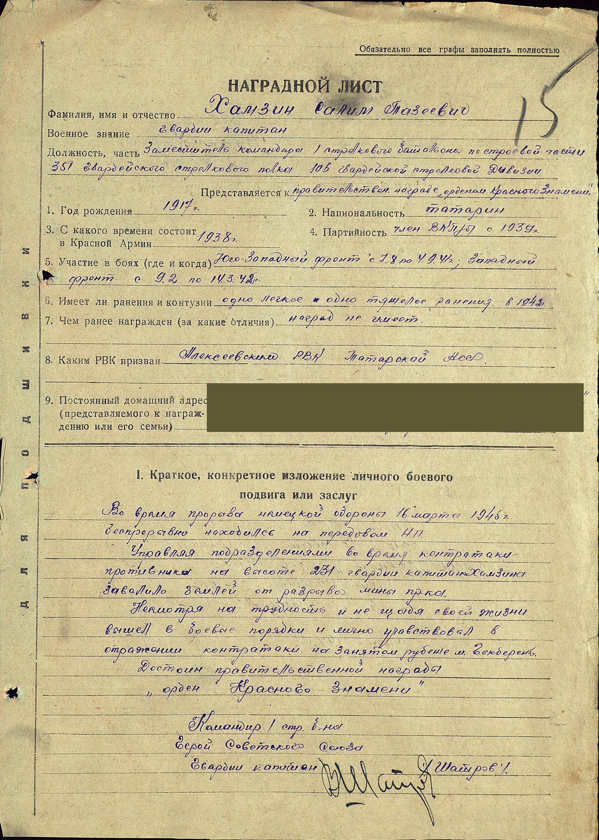 ХАМЗИН Салим Тазеевич, 1917, с. Мокр. Курнали. Мобилизован Алексеевским РВК в 1938. Служил в мотострелковых и воздушно-десантных частях, старшина, политрук роты. Воевал на ЮЗФ, ЗапФ, 3 УкрФ. В 1941 был тяжело ранен. Окончил курсы командиров батальонов. С марта 1943 по янв. 1945 - комиссар, адьютант старший, зам. ком. батальона, ком. батальона 7 гв. ВДБр. В 1945 - гв. капитан, пом. ком.бата по Сстроевой Части 351 гв. СП (переформирован из 7 отд. ВДБр в 1944) 106 гв. СД (переформирована из 16 гв. ВДД) 38 гв. СК (переформирован из 38 гв. ВД корпуса) 9 гв. А (переформирована из Отдельной воздушно-десантной армии). В 1941- 1942 был дважды ранен - легко и тяжело. Боевой путь: Западный, Юго-Западный фронт, Венгрия (Будапешт), Австрия, Чехословакия. Награждён орденом Красного Знамени (1945), медалями "За оборону Москвы", "За взятие Будапешта", "За взятие Вены", орденом Отечественной войны 1 ст. (1985).