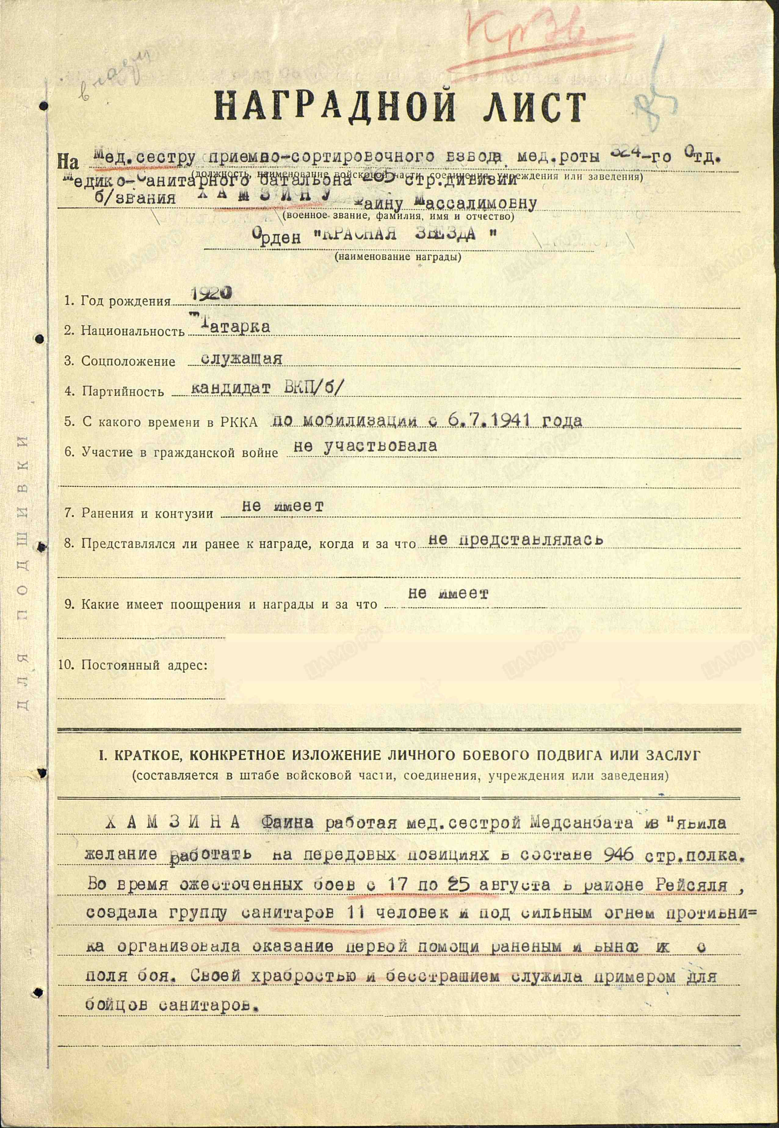 Из наградного листа: «Хамзина Фаина работая мед.сестрой изъявила желание работать на передовых позициях в составе 946 стр.полка. во время ожесточенных боев с 17 по 25 августа в районе Рейсяля, создала группу санитаров 11 человек и под сильным огнем противника организовала оказание первой помощи раненым и вынос их с поля боя. Своей храбростью и бесстрашием служила примером для бойцов санитаров. Лично сама вынесла с поля боя около 30 раненых с винтовками».