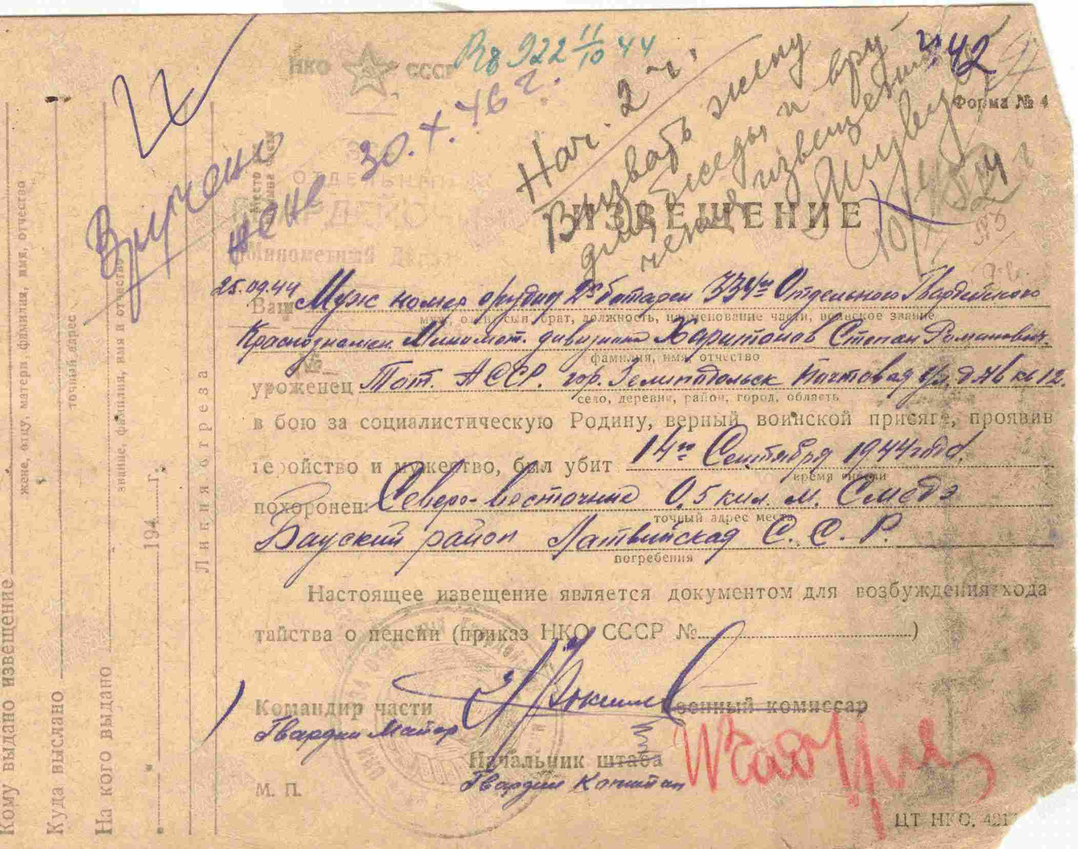 ХАРИТОНОВ Степан Романович, 1909, с. Лебедино. Мобилизован Зеленодольским РВК 1 апр./ 17 авг. 1942. Гв. красноармеец, орудийный номер 334 отд. гв. миномётного дивизиона 3 гв. МехК 51 А Южного фронта, 47 А Воронежского фронта, 3 Белорусского, 1 Прибалтийского фронта. Убит 14 сент. 1944, ЛатвССР, Баусский уезд, Цодская волость, м. Смедэ, похоронен на кладбище Стрелю.