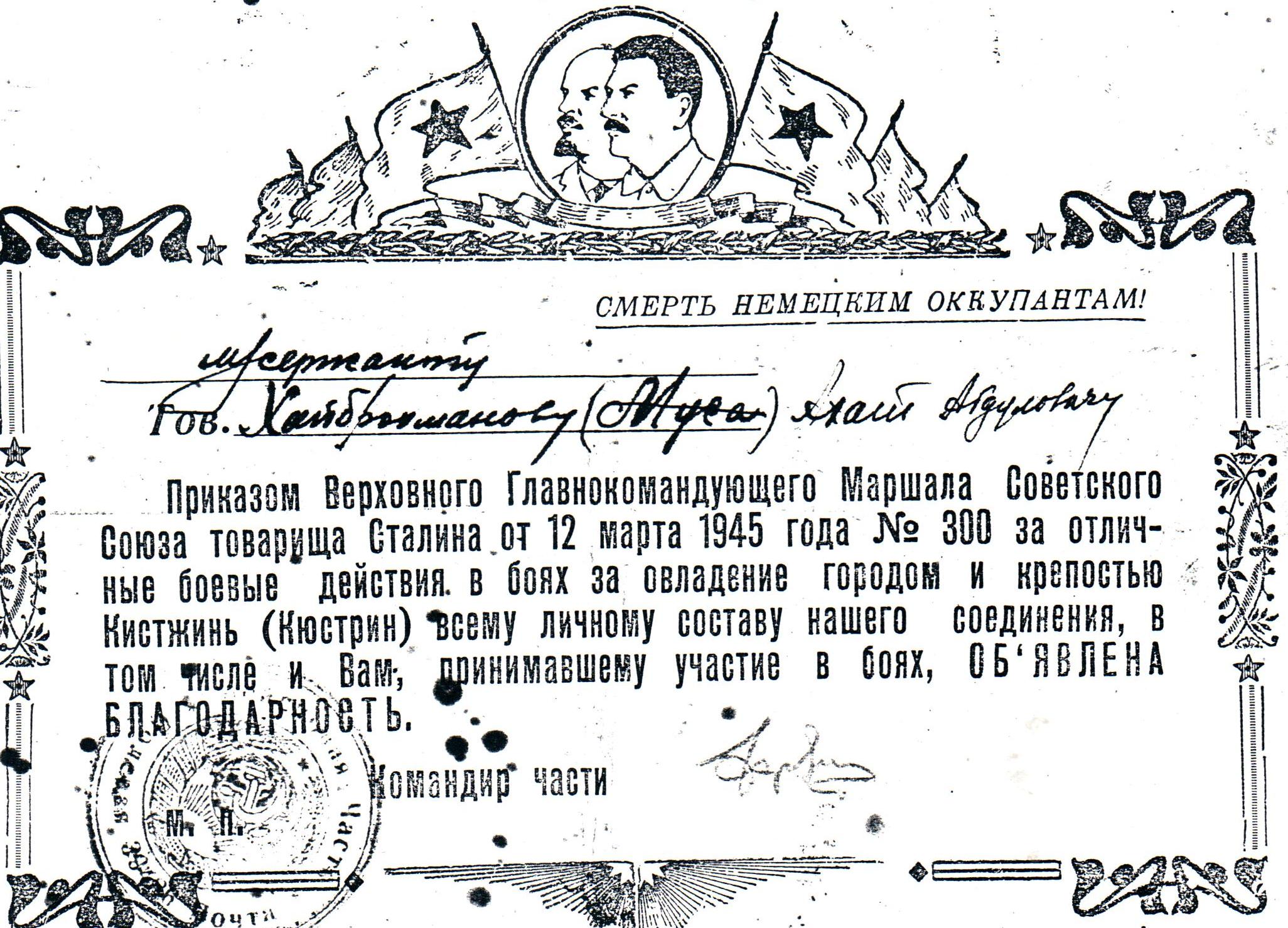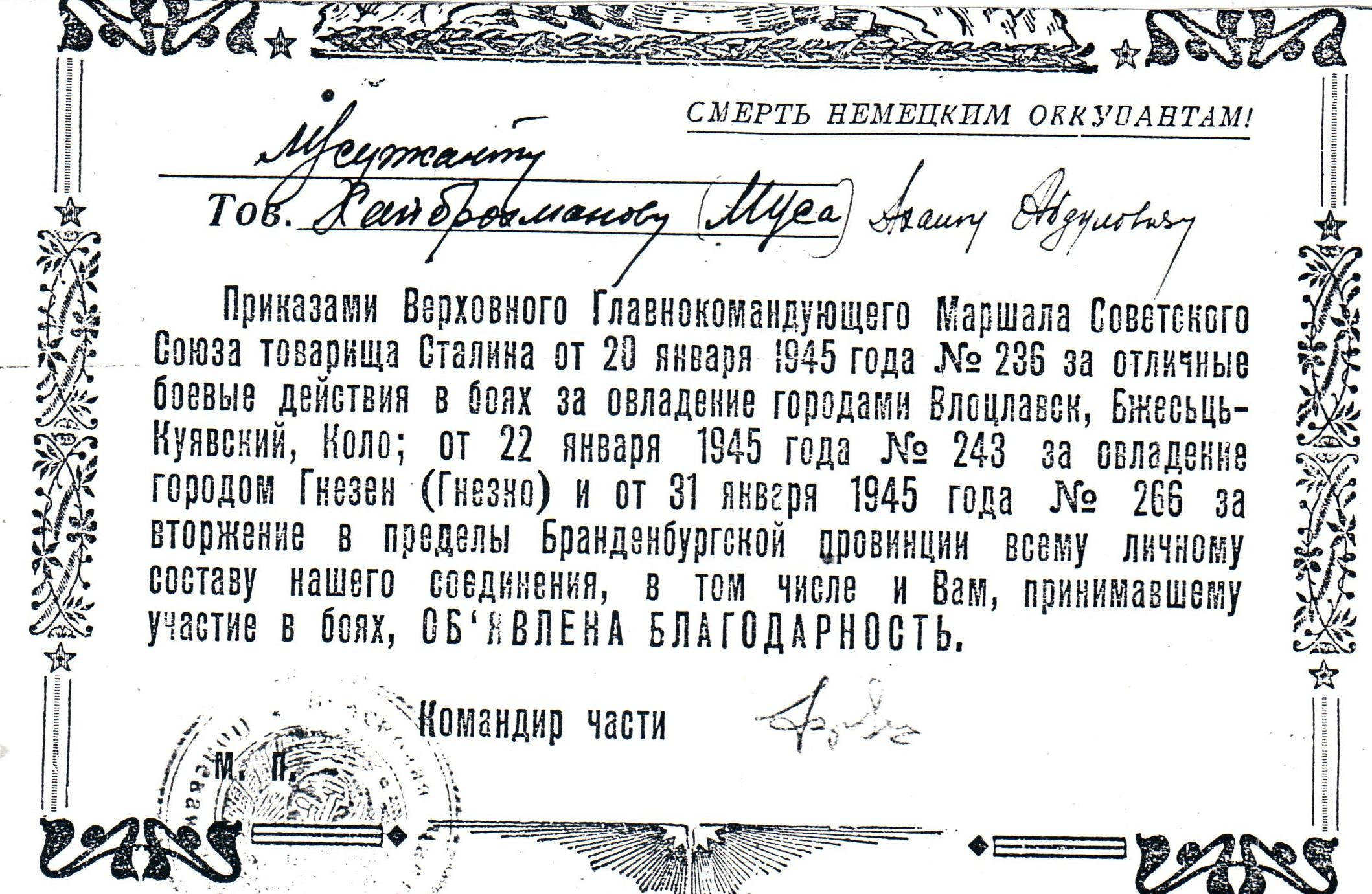7 ноября 1943 года десятерых молодых парней из Нижней Мактамы призвали в армию. Среди них был и Ахат Хайбрахманов. Подготовку проходит в районе станции Суслонгер Республики Марий Эл. Именно там, в годы Великой Отечественной войны находился лагерь для подготовки кадров для фронта. Основные задачи этого лагеря - подготовка командиров пулеметных взводов и обучение нерусскоязычного населения русскому языку, знание которого было необходимо на фронте. В апреле 1943 года вместе с другими такими, как и сам, Хайбрахманов направляется на фронт. Ахат Габдуллович воевал в I-ом Белорусском фронте 238 стрелковой дивизии пятой ударной армии в направлении Варшава - Берлин. Ахатом Габдулловичом в составе 1-го Белорусского фронта были освобождены города Влоцлавск, Бжесьць – Куявский, Коло, Гнезно и сотни населенных пунктов Польшы. За овладение города и крепостью Кюстрина, за отличные боевые действия в боях за овладение столицей Германии городом Берлин, Ахату Габдулловичу была объявлена благодарность. И лишь через семь лет, в 1950 году Хайбрахманову посчастливилось вернуться на родину.
