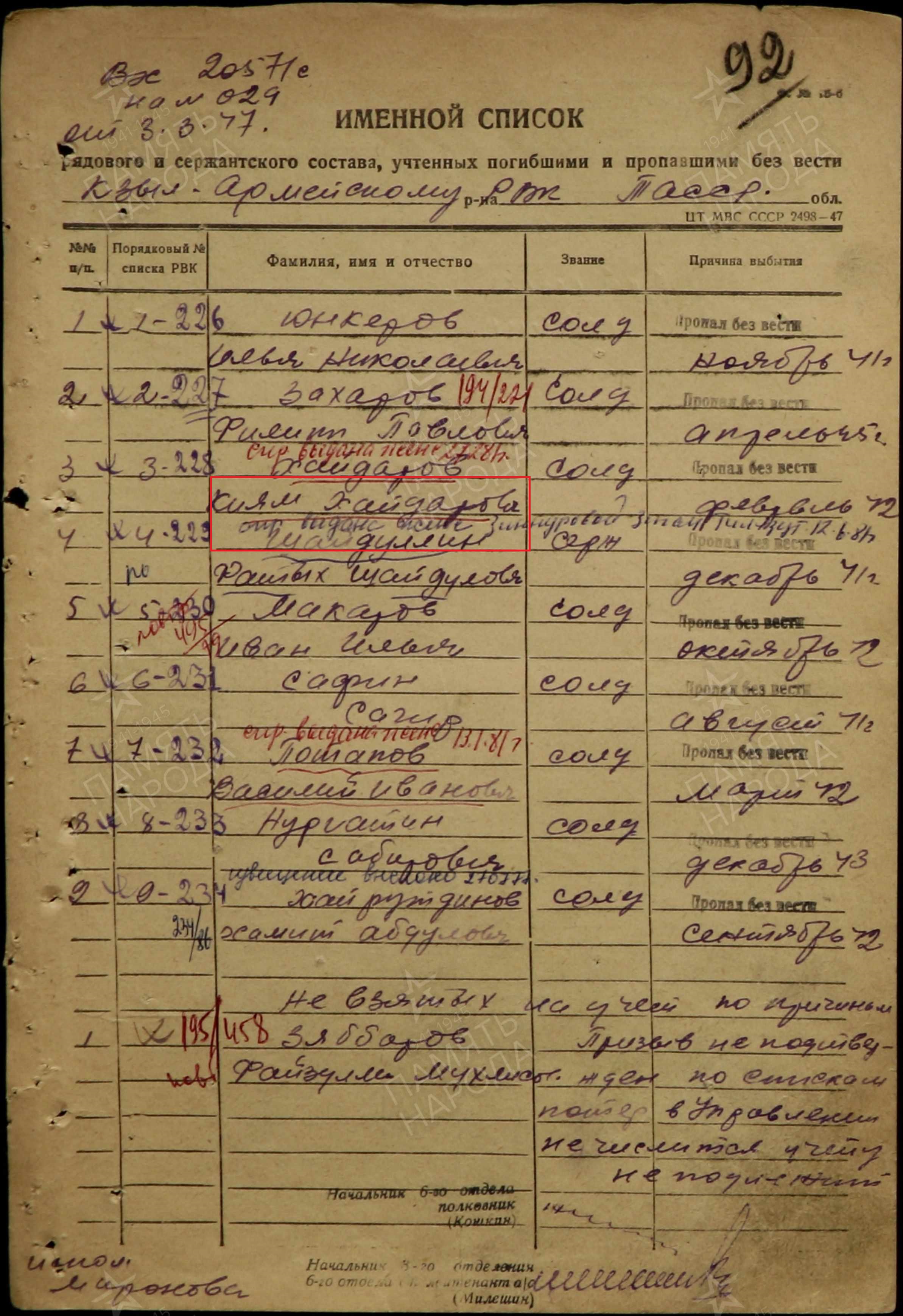 ХАЙДАРОВ КИЯМ ХАЙДАРОВИЧ родился в 1907 году в с.Шахмайкино Казанской губернии Чистопольского уезда Каргалинской волости (ныне с.Шахмайкино Новошешминского района РТ). Мобилизован Кзылармейским РВК,кр-ц. Пропал без вести 02.42.г.