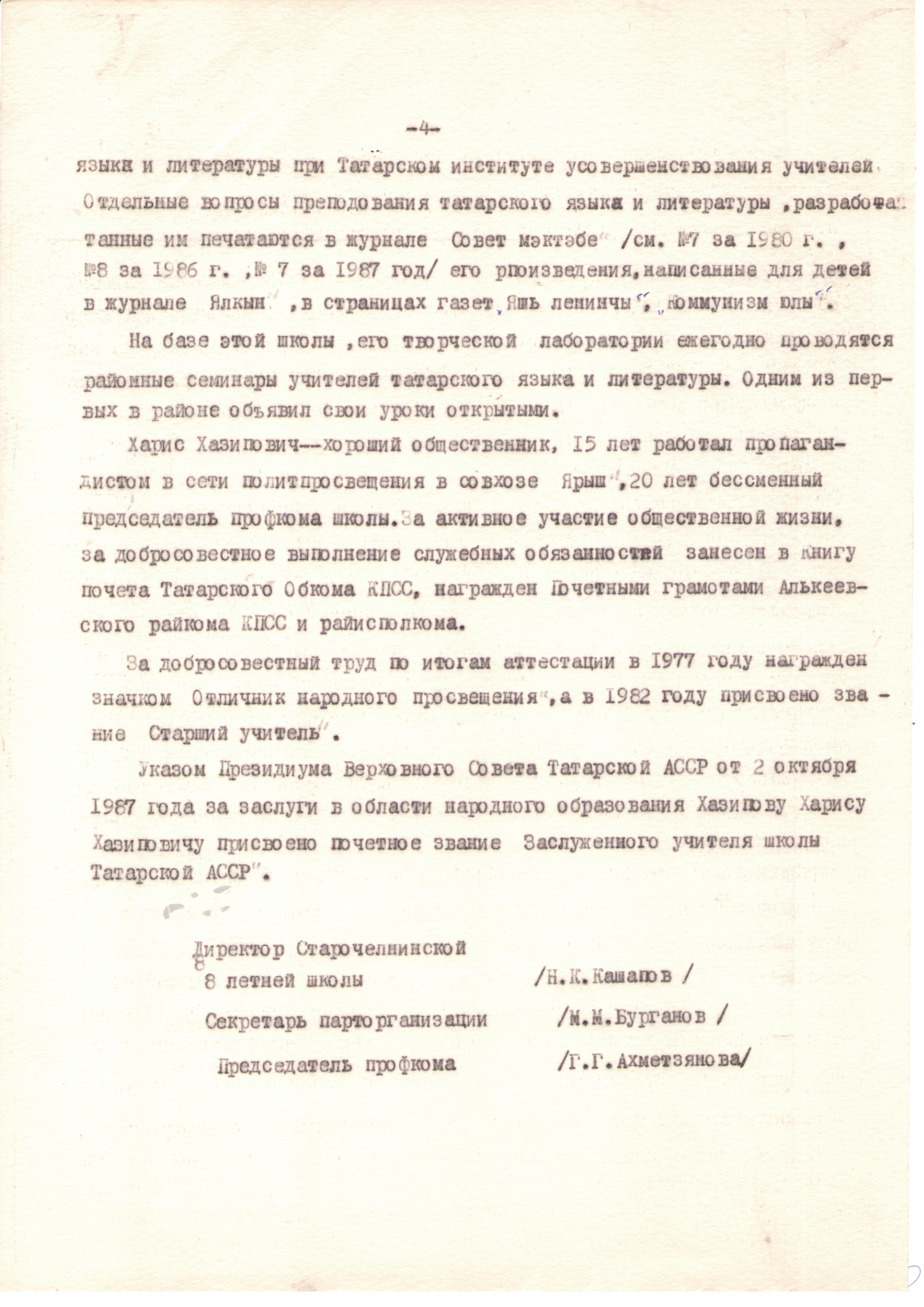 Родился в деревне Старые Челны в 1933 году. В 1962 году окончил историко-филологический факультет Казанского государственного педагогического института. С 1957 года работал учителем татарского языка и литературы Старочелнинской восьмилетней школы. В 1977 году награжден значком Отличник народного просвещения. Указом Президиума Верховного Совета Татарской АССР от 2 октября 1987 года за услуги в области народного образования Харисову Х.Х. присвоено почетное звание Заслуженного учителя школы ТАССР.