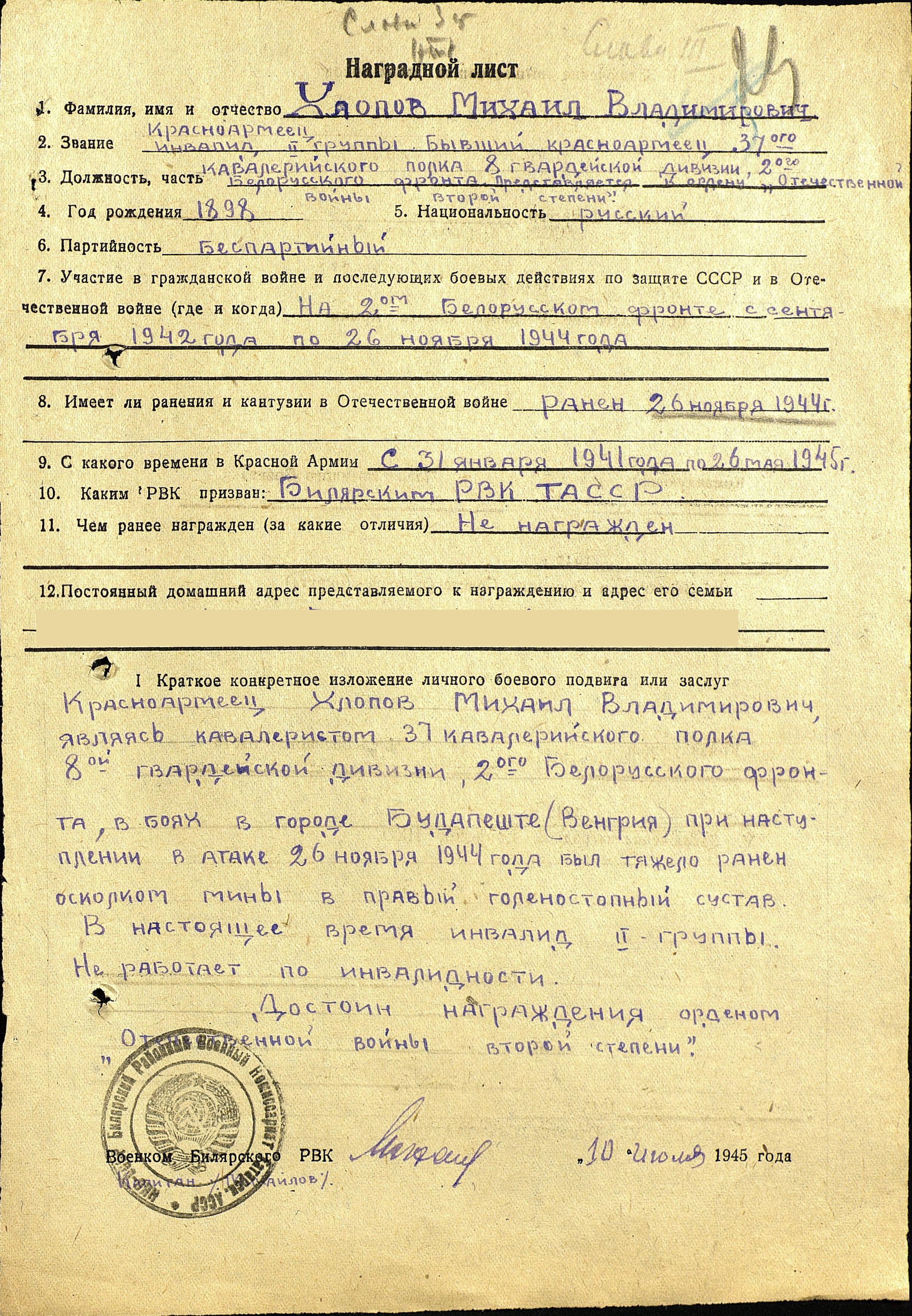 ХЛОПОВ Михаил Владимирович, 1898, с. Шама. Мобилизован Билярским РВК в январе 1942. На фронте с декабря 1942. Воевал кавалеристом на Воронежском, Западном, Белорусском, 1 и 2 Укр. фронтах, гв. красноармеец 31 гв. кав. полка 8 гв. кав. дивизии. Участник боёв в Смоленской обл., Белоруссии, освобождения Украины, боёв за Будапешт. 26 ноября 1944 был ранен осколком мины в правый голеностопный сустав. На излечении находился до 26 мая 1945. Признан инвалидом 2 гр. и демобилизован. Награждён орденом Славы 3 ст. (1945) - представлялся к ордену Отечественной войны 2 ст. Умер в 1983, похоронен в г. Екатеринбург.
