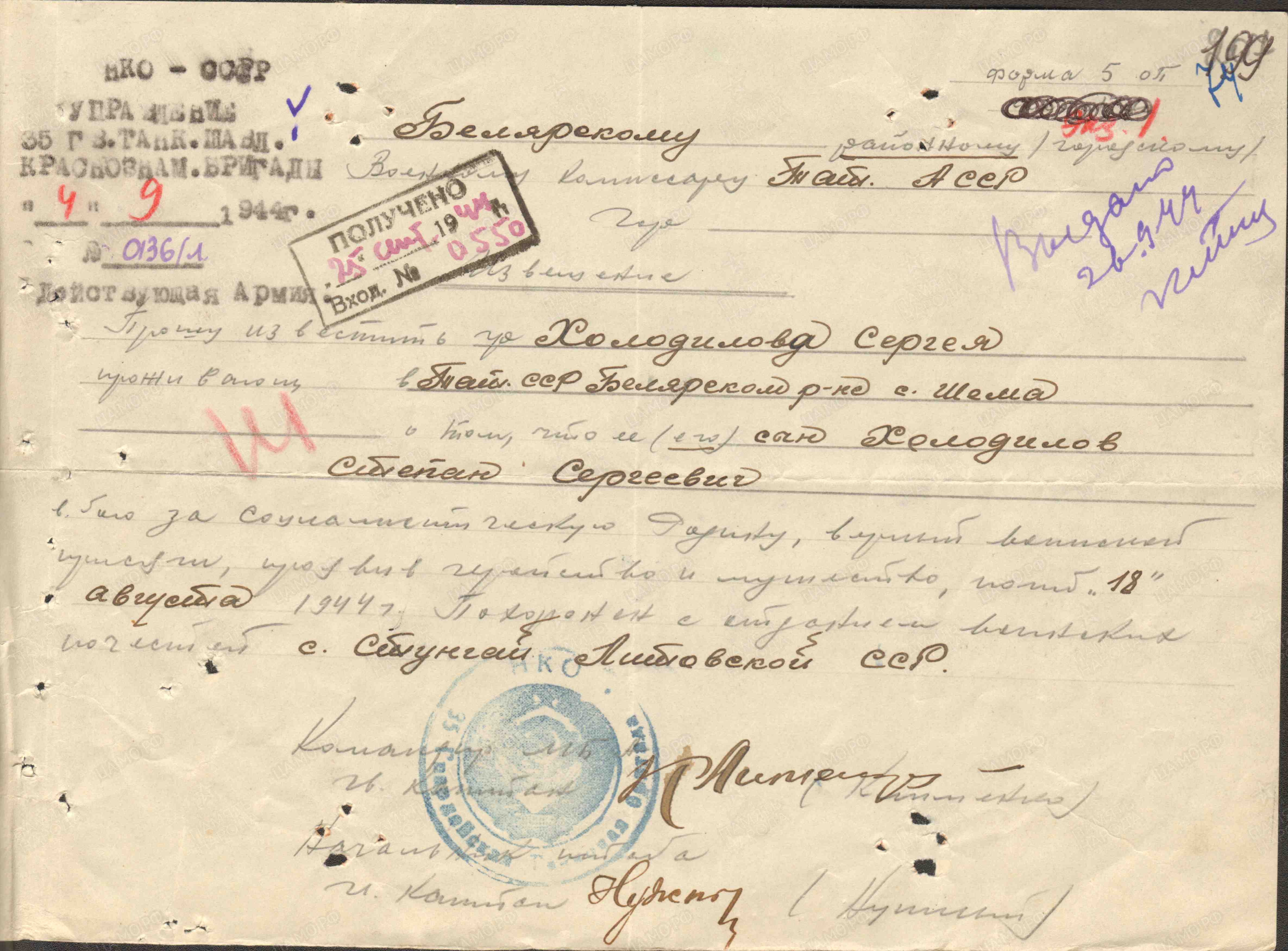 ХОЛОДИЛОВ Степан Сергеевич, 1921, с. Шама. Мобилизован в 1941 Билярским РВК. В 1943-1944 – гв. красноармеец, номер станкового пулемёта мотострелкового батальона 35 гв. Тбр 3 гв. МехК Воронежского, 3 Белорусского, 1 Прибалтийского фронта. Участник битвы на Курской дуге, освобождения Белоруссии и Прибалтики. Погиб 18 авг. 1944, с. Стулгиай, Кельмеский р-н, Литовская ССР.