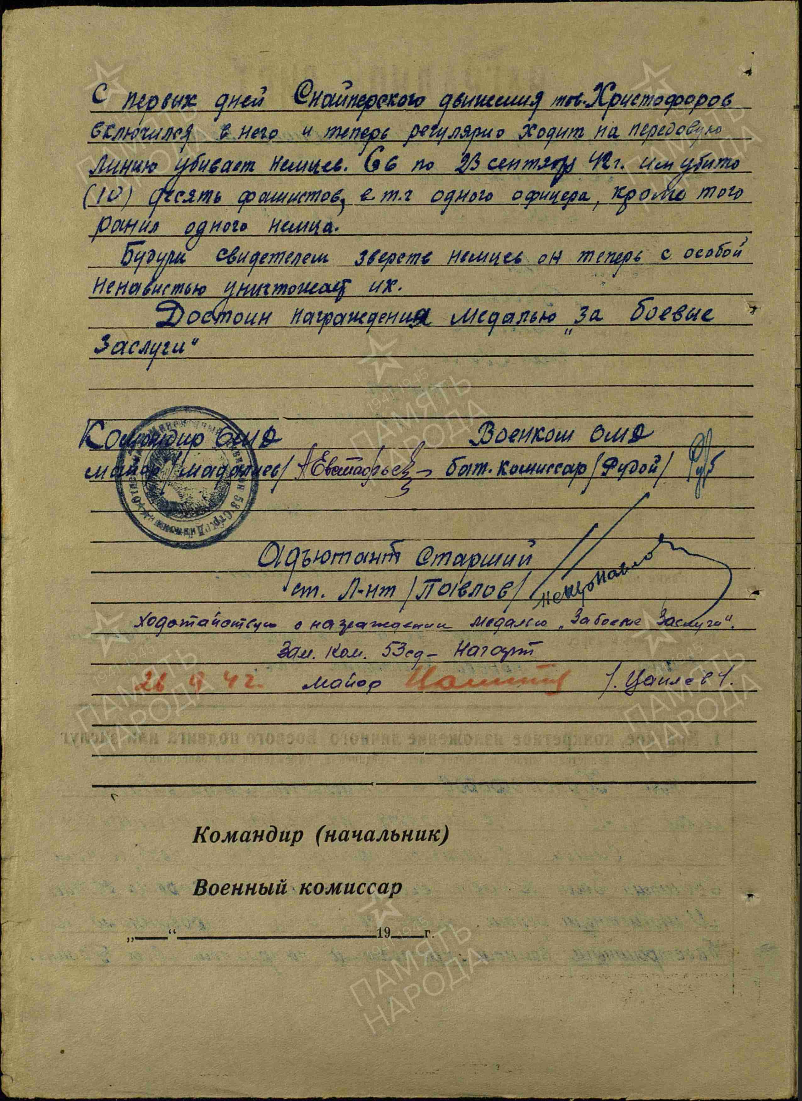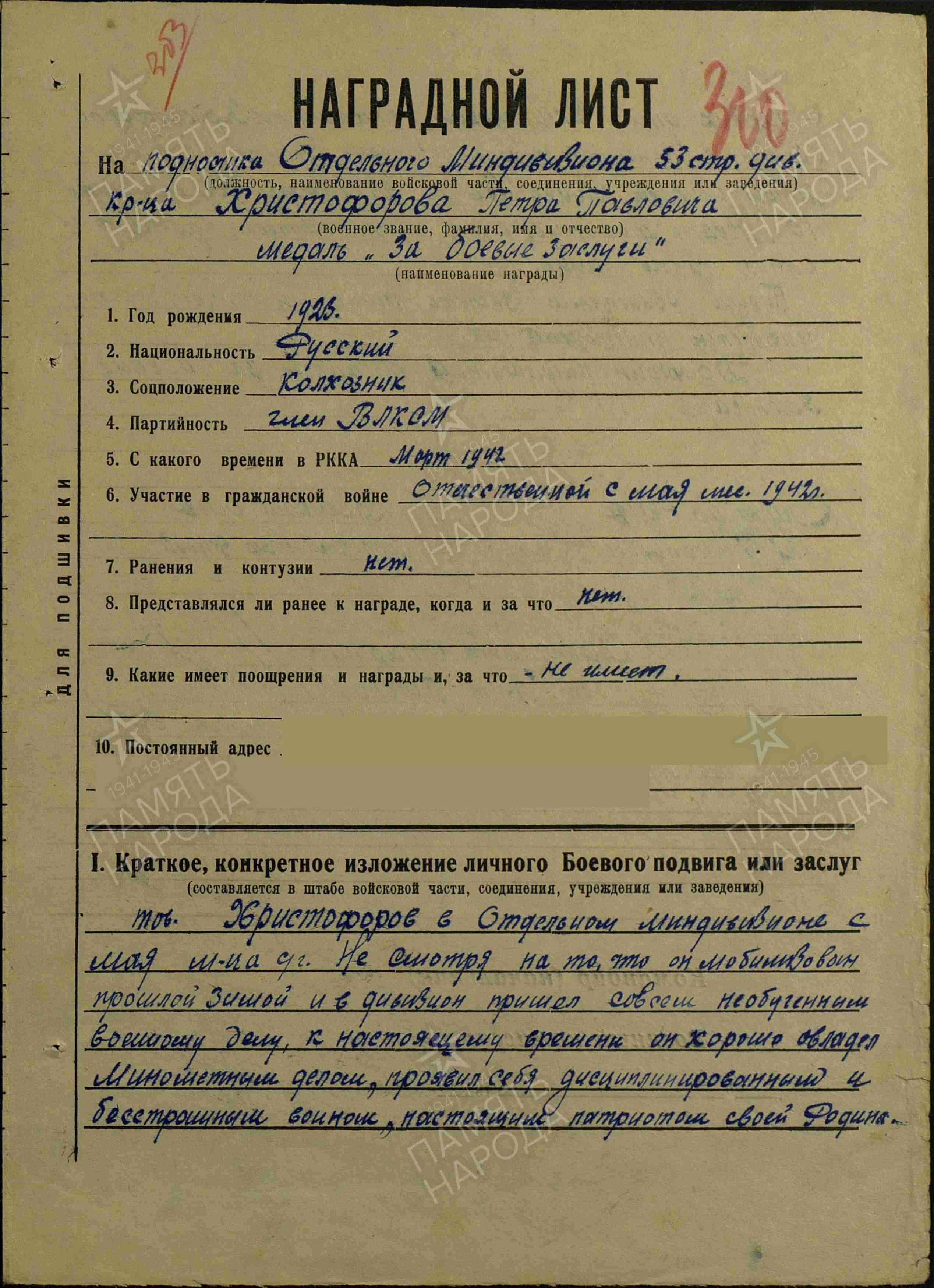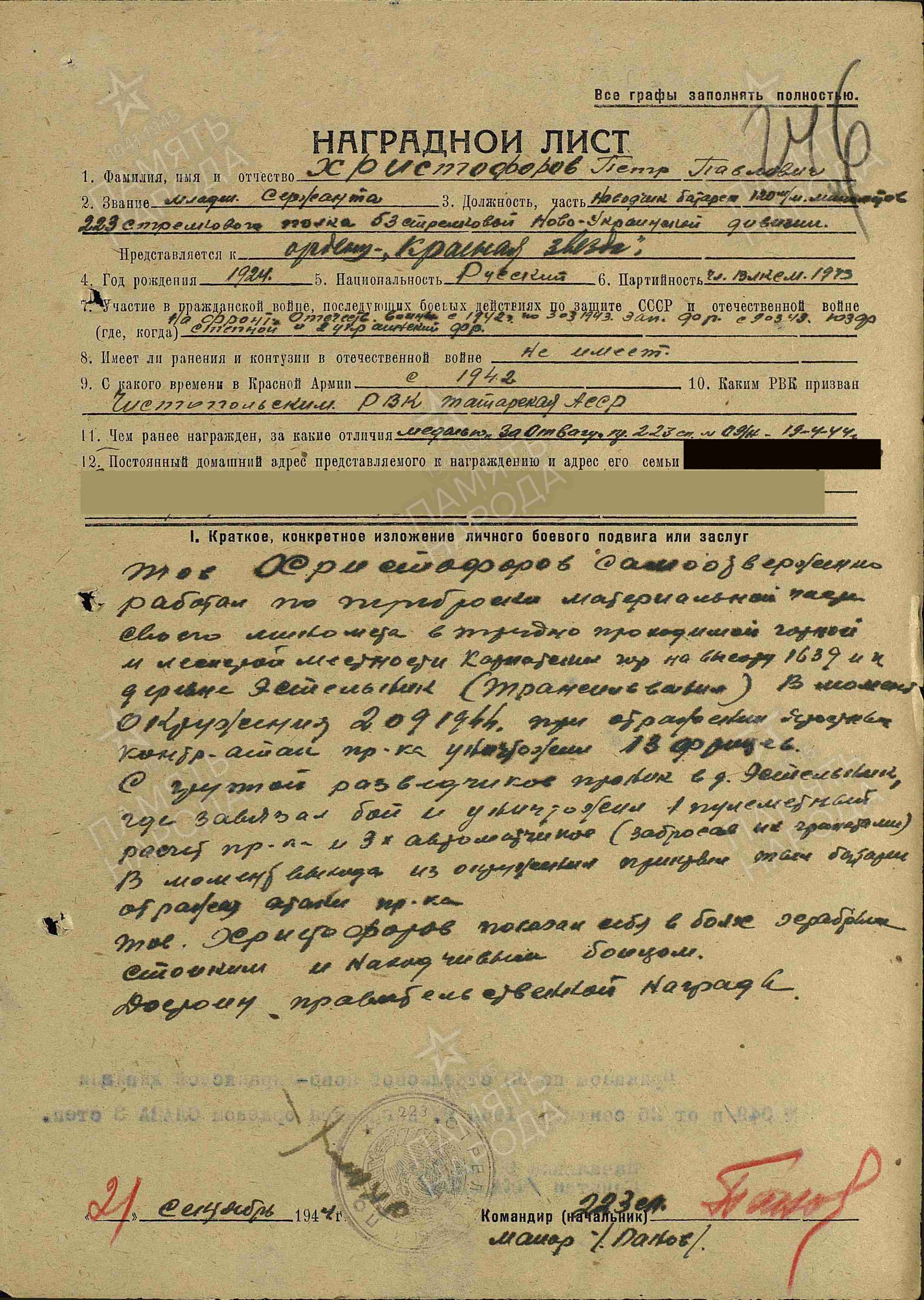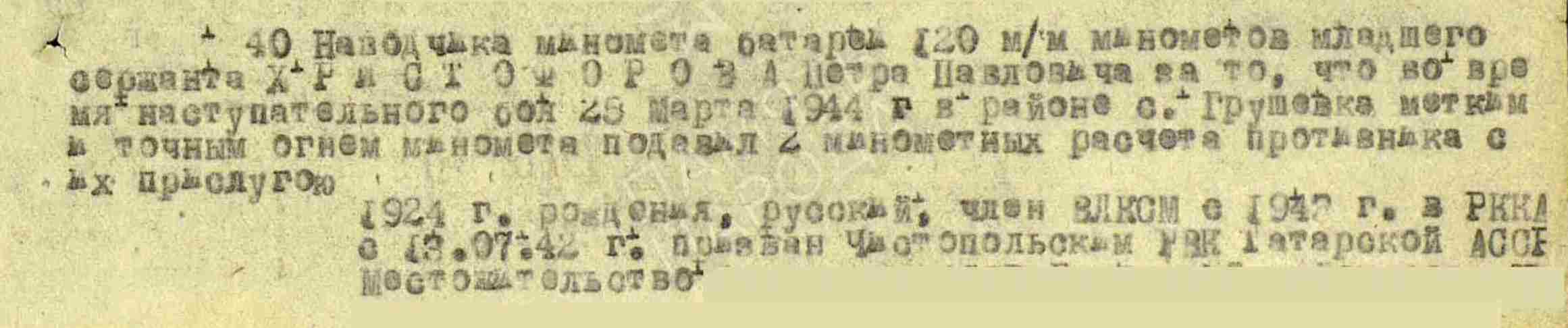 ХРИСТОФОРОВ Пётр Павлович, 1923, д. Николаевский Баран. Член ВЛКСМ. Мобилизован Чистопольским РВК 1 марта 1942. Красноармеец, подносчик отд. миномётного дивизиона 53 СД 43/33 А ЗапФ. Несмотря на отсутствие первоначальной военной подготовки, отлично освоил миномётное дело. С первых дней активно включился в снайперское движение, выходил на передовую, и с 6 по 23 сент. 1942 убил десять немцев, в том числе офицера, а также ранил одного. В дальнейшем воевал наводчиком 120 мм миномёта в составе 12 СП и 223 СП 53 СД 6 гв. СК 1 гв. А/37 А/7 гв. А/57 А/46 А на Юго-Западном, Степном, 2 Укр. фронтах, мл. сержант. Расчёт миномёта за время боёв в июле 1943 уничтожил пулемётную точку и несколько «фрицев». 25 марта 1944, в наступательном бою у с. Грушевка, метким огнём подавил два немецких миномёта с их прислугой. В сент. 1944, в условиях труднопроходимой гористой и лесистой местности Карпат, отлично справился с переброской мат. части миномёта на высоту 1639,0. 2 сент. 1944, у д. Ястелынек, Трансильвания, при отражении контратак врага истребил 13 гитлеровцев. С группой разведчиков проник в деревню, в завязавшемся бою гранатами уничтожил пулемётный расчёт и трёх автоматчиков. Награждён медалями «За боевые заслуги», «За взятие Вены», двумя медалями «За отвагу», орденом Славы 3 ст.