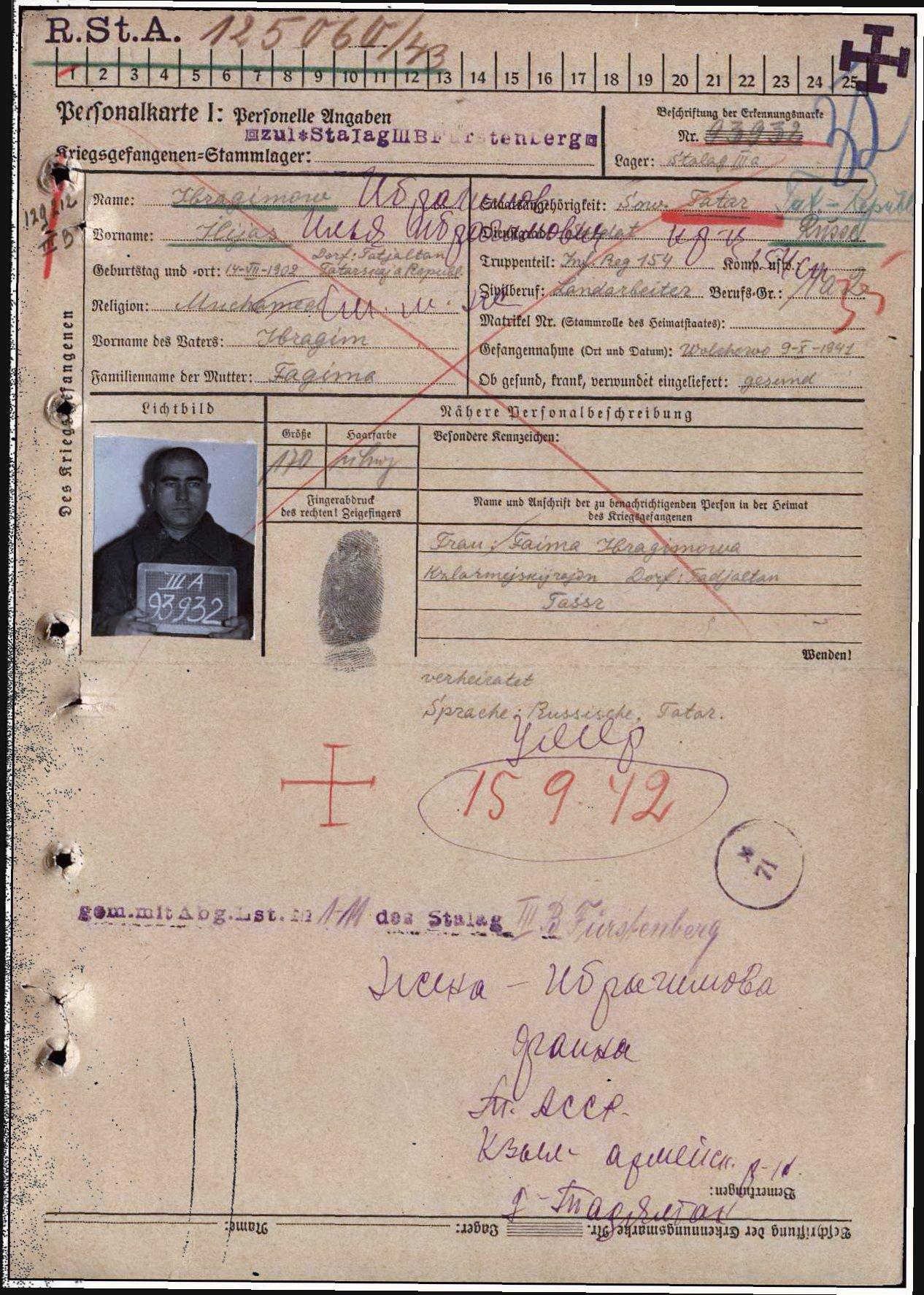 Родился 14 июля 1902 г. в с. Татарский Елтань Чистопольского уезда Казанской губернии. Лагерный номер 93932. Пленён 9 октября 1941 г. под Волховом. Содержался в шталаге III A. Рядовой Ибрагимов Ильяс Ибрагимович погиб в плену 15 сентября 1942 г.