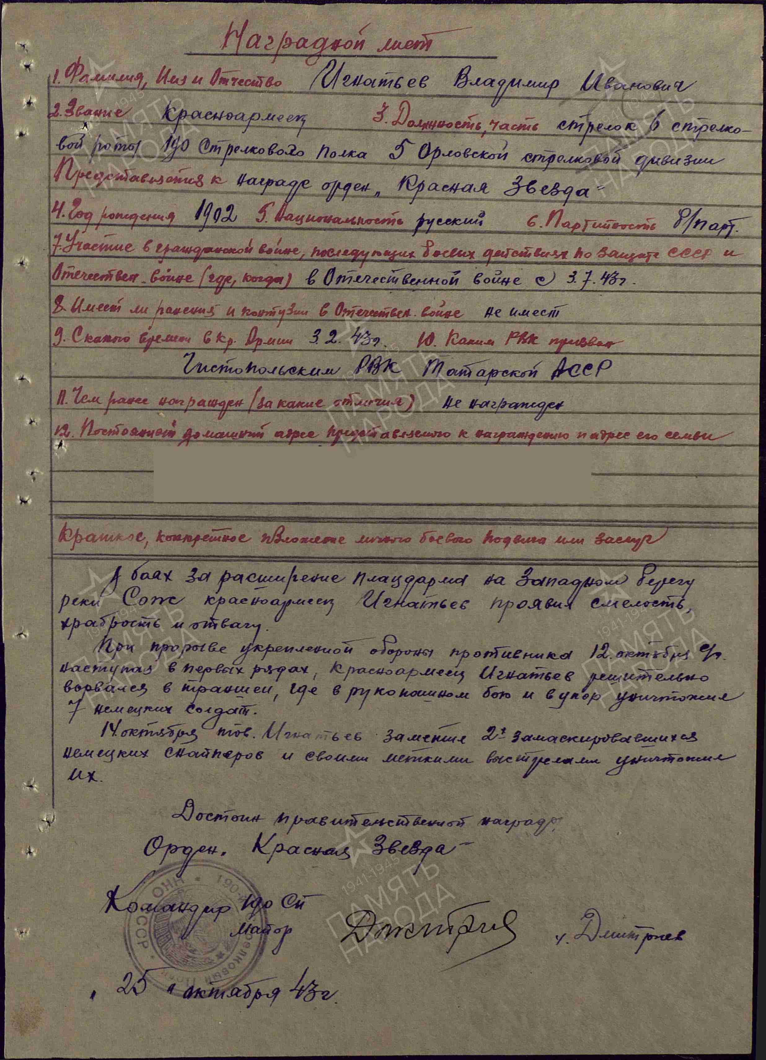 ИГНАТЬЕВ Владимир Иванович, 1902, с. Новоспасск. Мобилизован 3 фев. 1943 Чистопольскам РВК. С 5 июля 1943 воевал на Брянском, Белорусском, 1, 2 и 3 Белорусском фронте в составе 63 А и 3 А. Участник битвы на Курской дуге, освобождения Белоруссии и Прибалтики, боёв в Вост. Пруссии. Красноармеец, стрелок/ санитар-носильщик 190 СП 5 СД. «В боях на подступах к г. Вылковыск (Вилкавишскис) вынес из-под огня противника 21 тяжело раненых бойцов». Награждён орденом Красной Звезды, медалью «За отвагу». Погиб 14 марта 1945, п. Кениглих (Ольховка), Вост. Пруссия (Гвардейский гор. округ, Калининградская обл.).