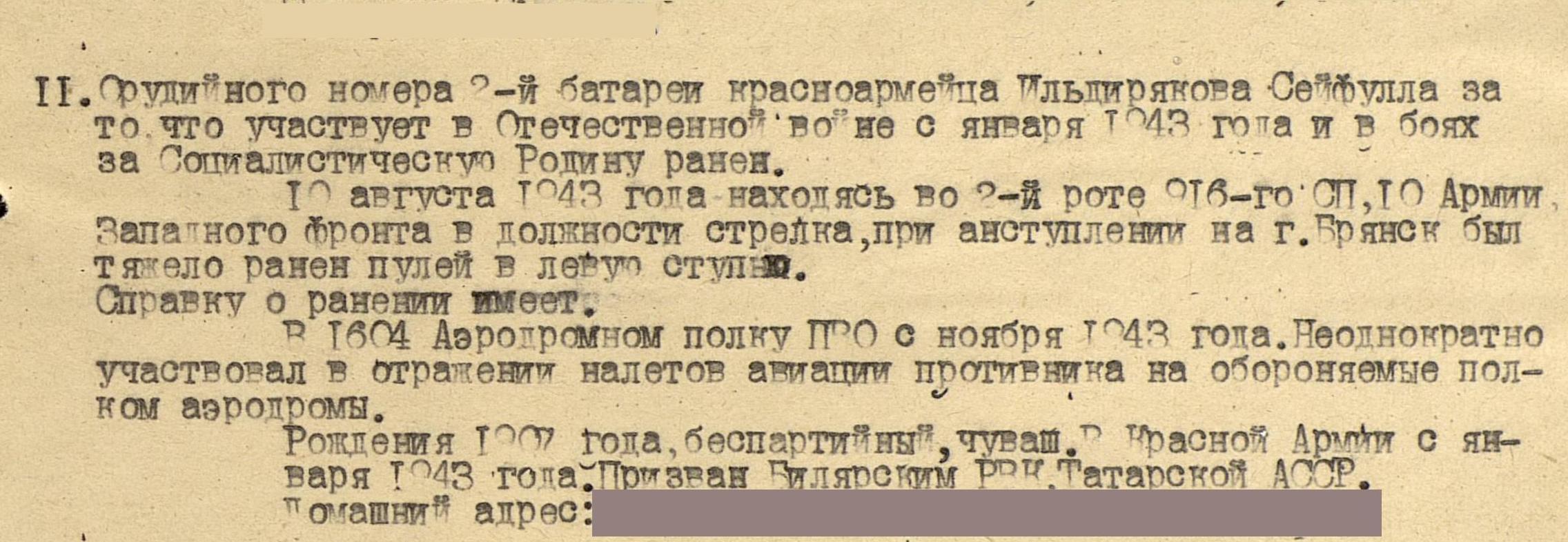 Вариант написания фамилии - ИЛЬДЕРЯКОВ. Родился в 1907 г. в с. Шама. Мобилизован Билярским РВК в 1943 г. Красноармеец, стрелок 916 стр. полка 247 стр. дивизии 10 А. На фронте с июля 1943 г. В бою 10 августа 1943 г. был тяжело ранен в левую ступню пулей при наступлении под г. Брянск. С ноября 1943 г. продолжил службу в 1604 аэродромном артполку ПВО 3 Возд. А в качестве орудийного номера. Награждён медалью "За боевые заслуги", медалью "За победу над Германией". Демобилизован в 1945 г. Работал в колхозе с. Шама. Скончался в 1985 г.