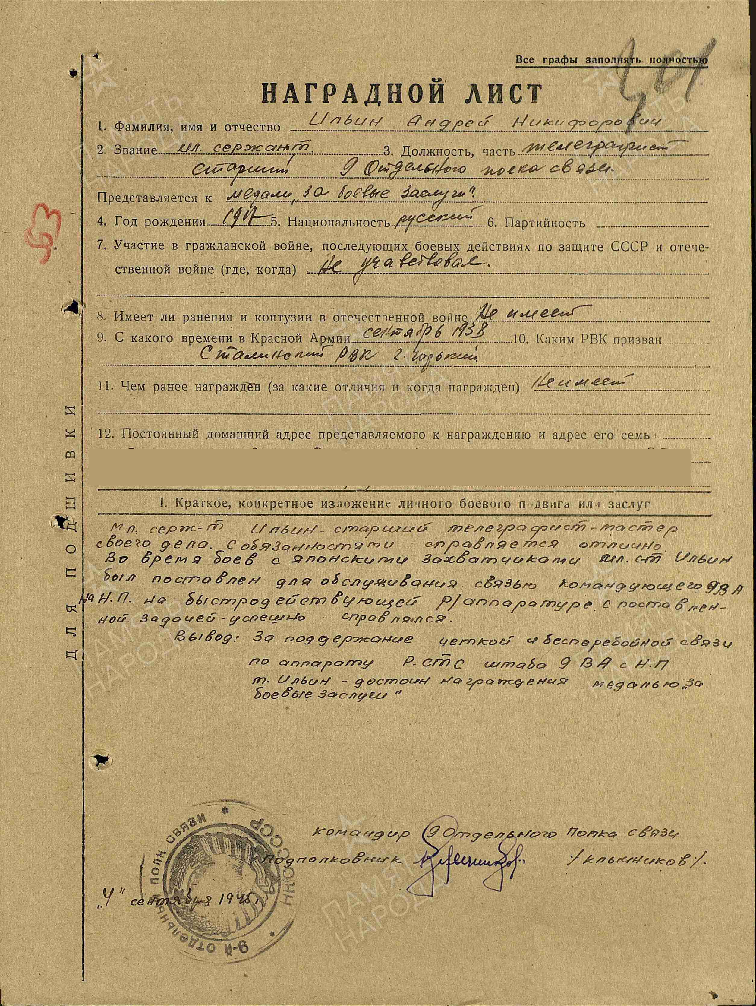 ИЛЬИН Андрей Никифорович, 1917, с. Остолопово. Призван в РККА в сент. 1938 Сталинским РВК г. Горький. Служил на Дальнем Востоке. Участник Советско-японской войны. Мл. сержант, ст. телеграфист 9 отд. Полка связи 9 ВА 1 Дальневосточного фронта. Награждён медалями «За боевые заслуги», «За победу над Германией», орденом Отечественной войны 2 ст. (1985).