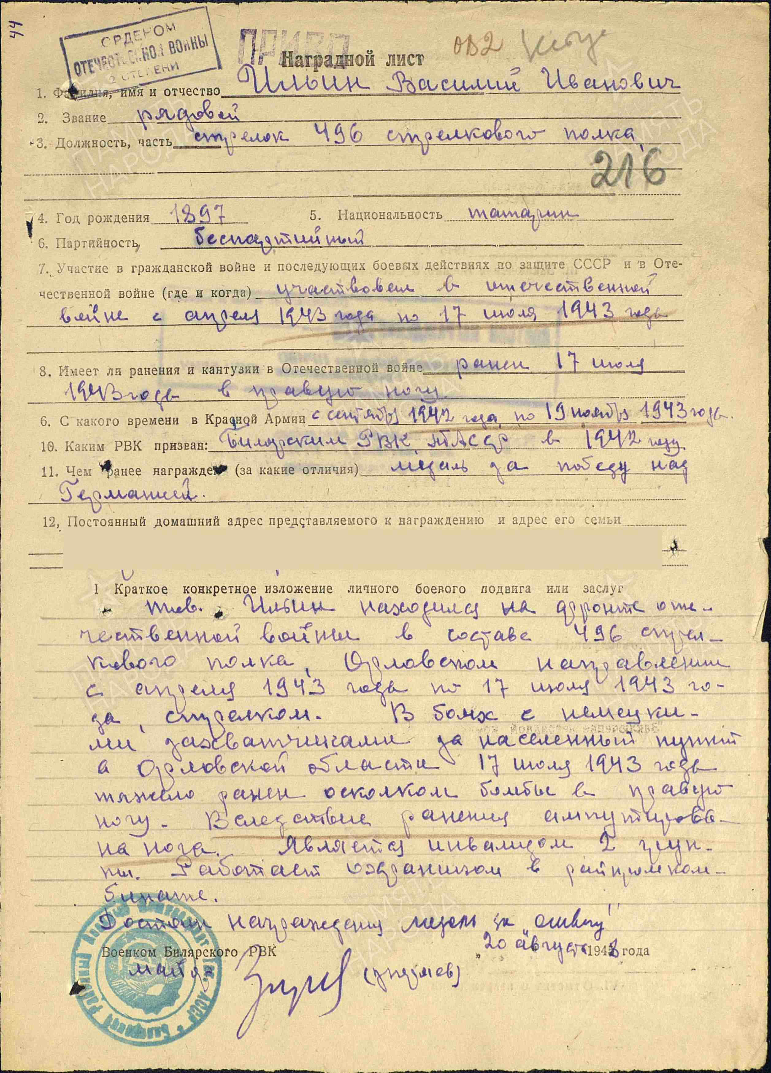 ИЛЬИН Василий Иванович, 1897, д. Крещёный Баран. До призыва в армию работал в к-зе. Мобилизован Билярским РВК 27 сент. 1942. Красноармеец. Воевал в составе 172 СД 6 А Воронежского/ Юго-Западного фронта, 496 СП 148 СД 13 А Центрального фронта. Участвовал в битве на Курской дуге. Тяжело ранен на Орловском направлении 17 июля 1943 осколком авиабомбы в правую ногу. В результате ранения нога ампутирована. Демобилизован 19 нояб. 1943 по инвалидности 2 гр. Работал охранником Райпромкомбината. Награждён орденом Отечественной войны 2 ст. (1951).