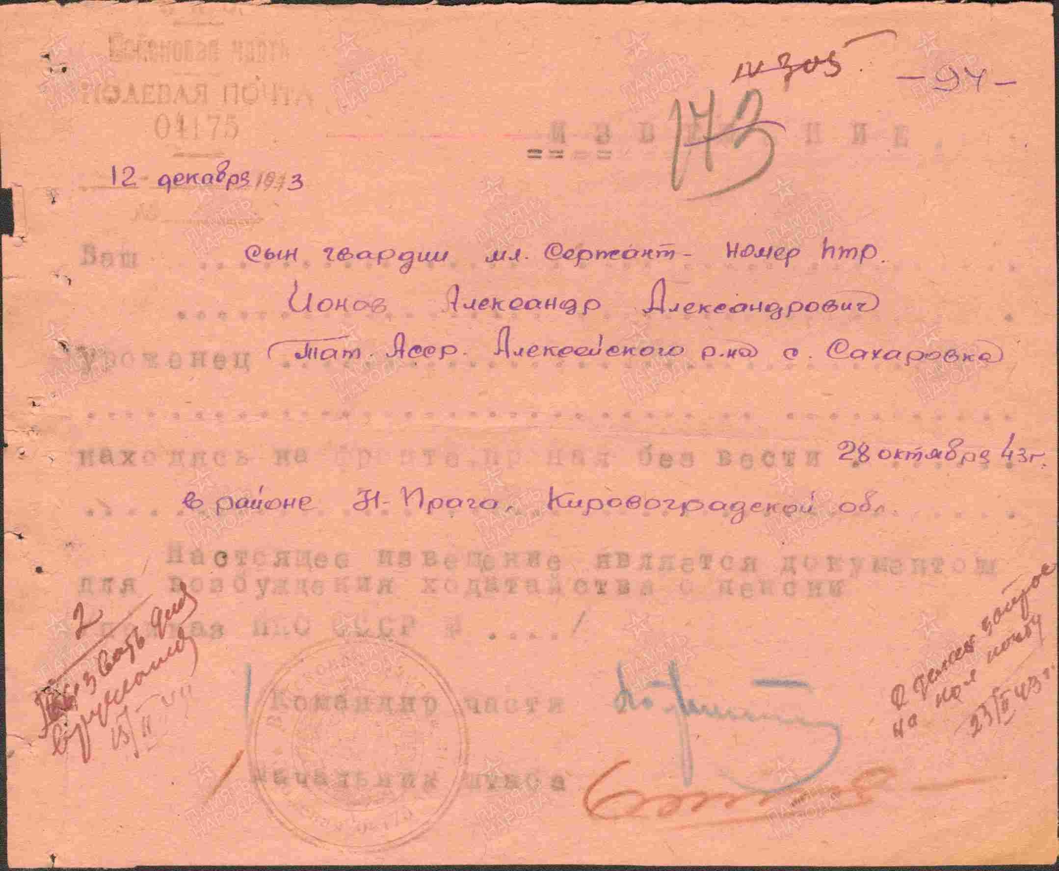 ИОНОВ Алексей Александрович, 1925, с. Сахаровка. Мобилизован 8 янв. 1943 Алексеевским РВК. Гв. мл. сержант, номер ПТР 11 гв. МехБр, 5 гв. МехК 5 гв. ТА Воронежского/ 2 Украинского фронта. Убит 28 окт. 1943, п. Новая Прага, Александрийский р-н, Кировоградская обл., УкрССР.