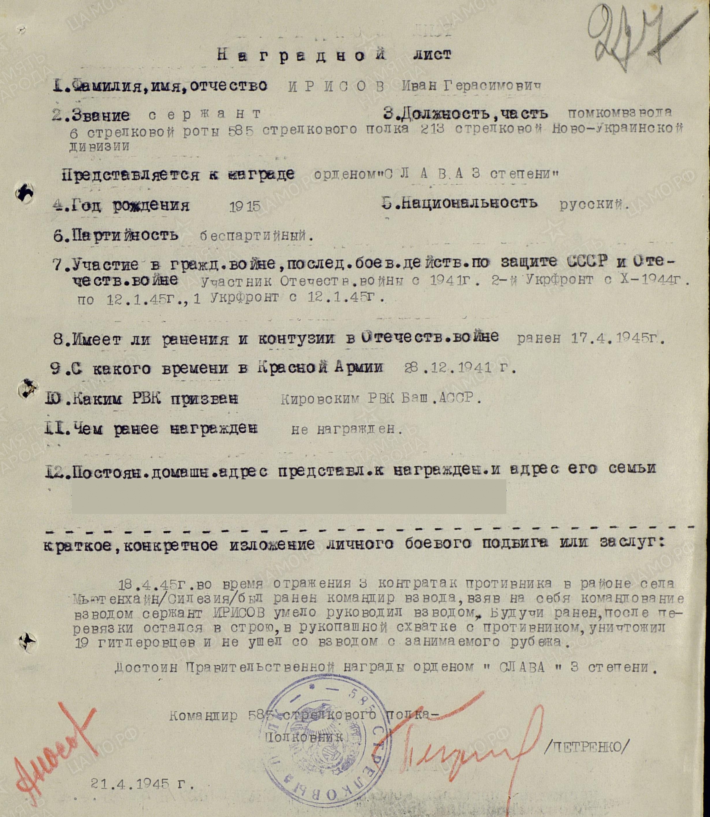 ИРИСОВ Иван Герасимович, 1915, с. Остолопово. Мобилизован в дек. 1941 Кировским РВК г. Уфа. В 1945 – сержант, пом. ком. взвода 585 СП 213 СД 52 А 1 УкрФ. 18 апр. 1945 при отражении трёх контратак противника в р-не с. Мютенхайн (Силезия) взял на себя командование взводом, будучи раненым остался в строю. Вместе со взводом в рукопашном бою уничтожил 19 гитлеровцев. Награждён орденом Славы 3 ст.