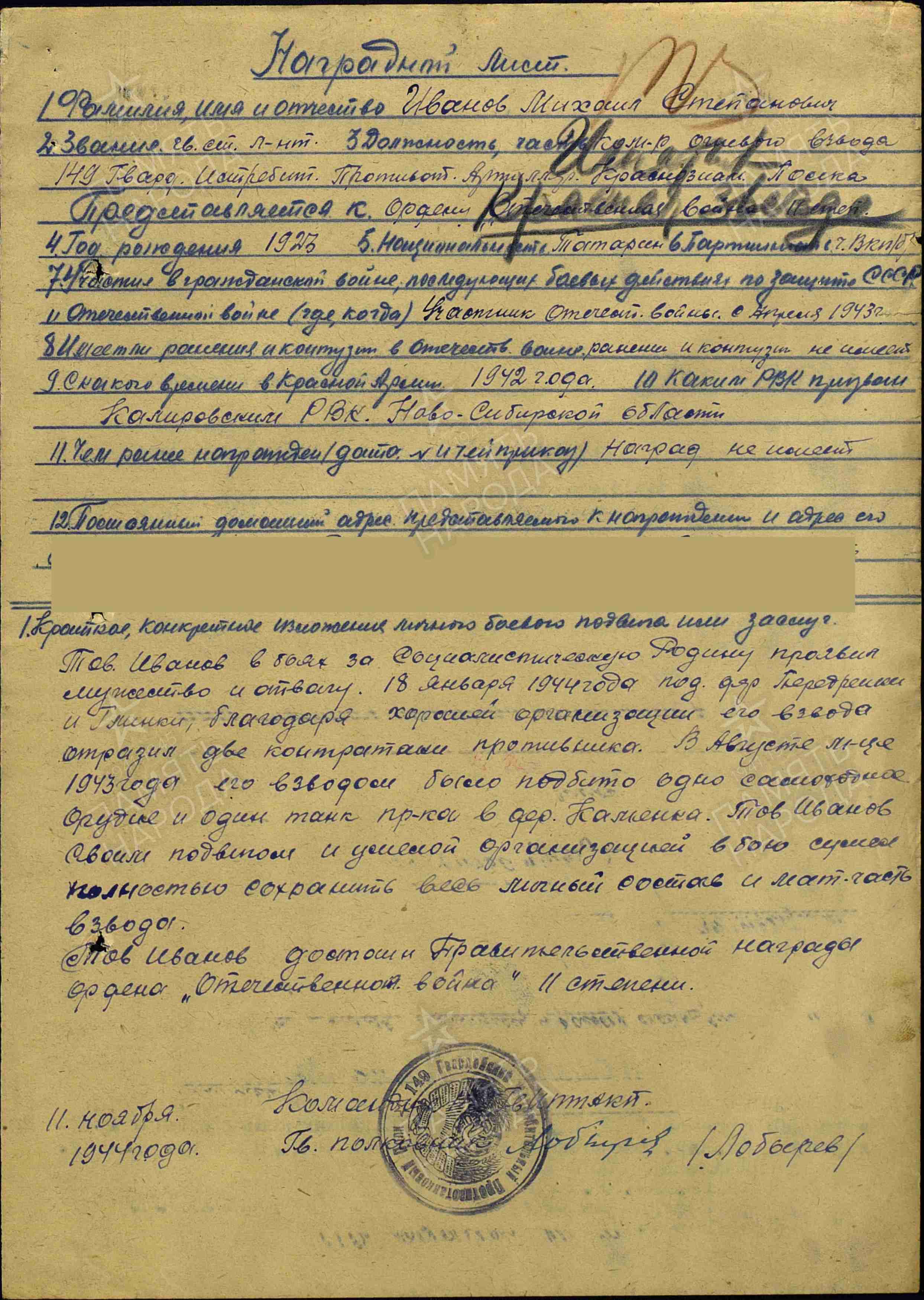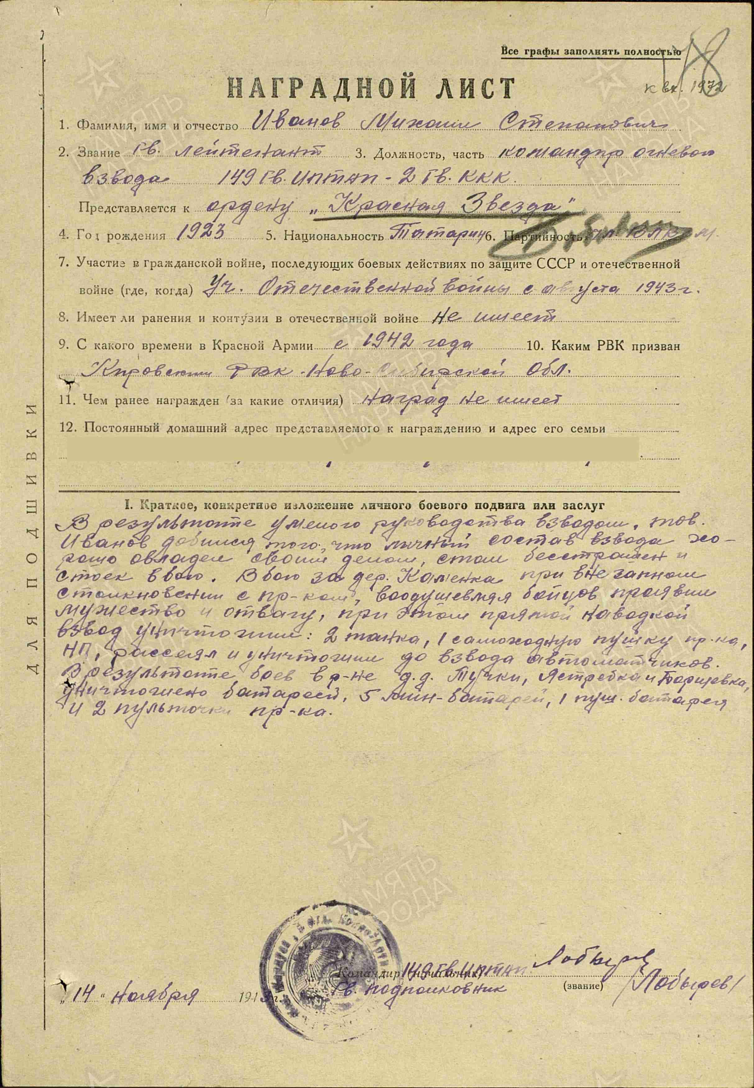 ИВАНОВ Михаил Степанович, 1923, д. Красный Баран. Мобилизован 13 июня 1942 Кировским РВК г. Новосибирск. Член ВЛКСМ/ВКП(б). В боях с апр./ авг. 1943. Гв. лейтенант/ гв. ст. лейтенант, ком. огневого взвода 149 гв. ИПТАП 2 гв. КавК Брянского фронта, 61 А Белорусского фронта, 2 и 1 БелФ. Награждён двумя орденами Красной Звезды (1943, 1944), орденом Отечественной войны 1 ст. (1985).
