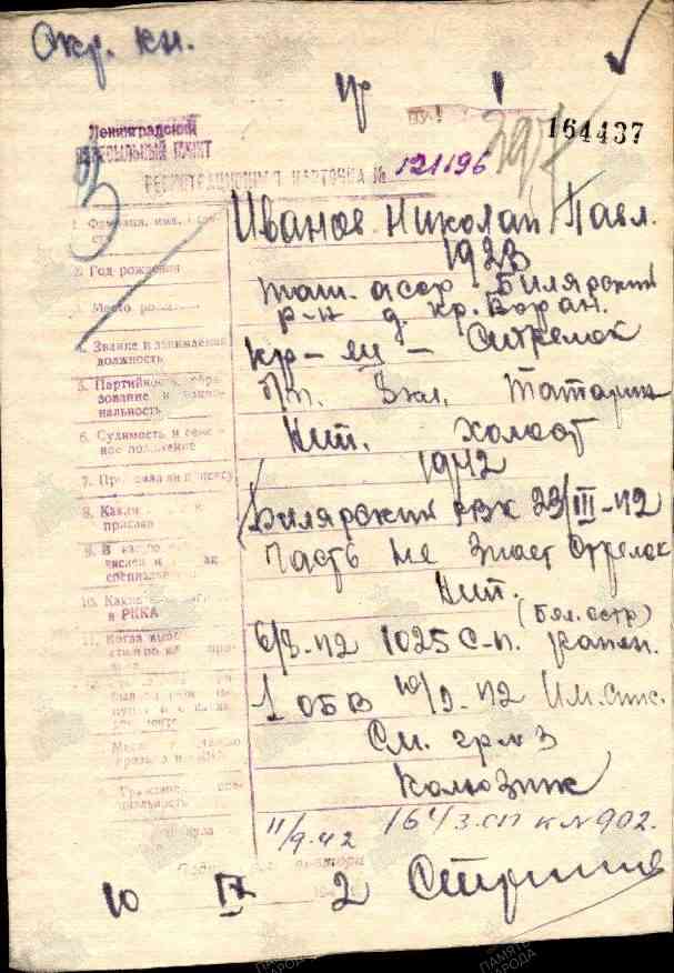 ИВАНОВ Николай Павлович, 1923, д. Крещёный Баран. До призыва в армию работал в к-зе «Семеновод». Мобилизован Билярским РВК 24 марта 1942. Красноармеец, стрелок 1025 СП 291 СД 23 А Ленинградского фронта. Ранен 8 авг. 1942. Проходил лечение в ЭГ 2222, г. Ленинград, до 11 сент. 1942. Направлен в батальон выздоравливающих, далее в действующую в/часть. Письменная связь с семьёй прекратилась в дек. 1942. Учтён пропавшим без вести.