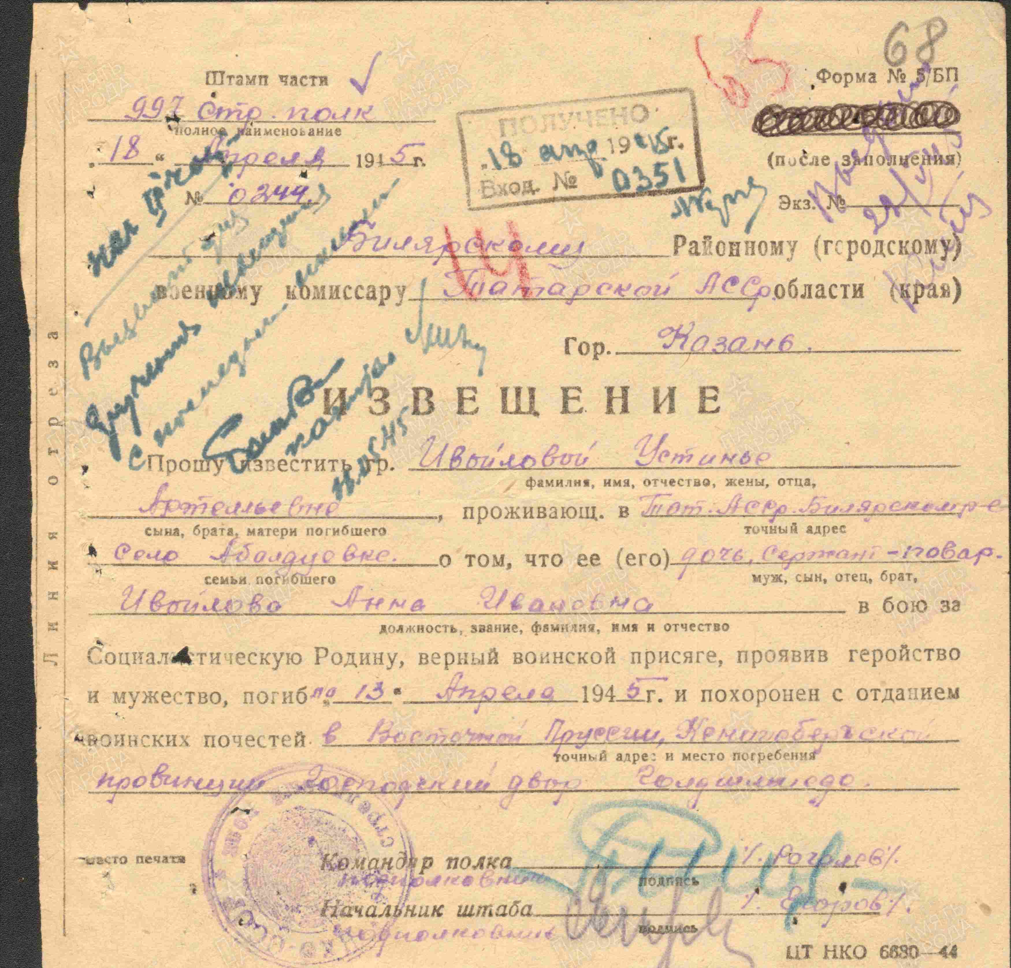 ИВАЙЛОВА (ИВОЙЛОВА) Анна Ивановна, 1924, с. Абалдуевка/ с. Билярск. До призыва в армию работала в к-зе им. Куйбышева. Мобилизована Билярским РВК 28 мая/ 23 июня 1944. Член ВЛКСМ. Сержант, повар 997 СП 263 СД 2 гв. А/ 6 гв. А 1 Прибалт., 43 А 3 Белорусского фронта. Погибла 13 апр. 1945, м. Гольдшиде, Кёнигсбергский округ, Вост. Пруссия. Увековечена на мемориале по ул. Лукашова, г. Чкаловск, Калининградская обл.