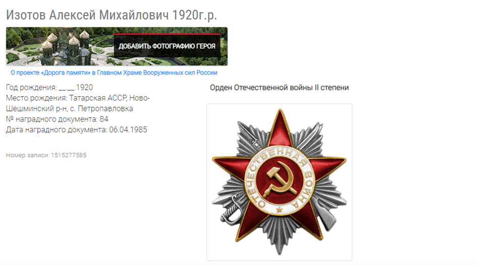 ИЗОТОВ Алексей Михайлович родился в 1920 году в с.Слобода Петропавловская Казанской губернии Чистопольского уезда Новошешминской волости. Мобилизован в 1939 году Новошешминским РВК, ряд., 902 сп, 12 А. Демобилизован в 1942 году. Место работы: колхоз им. Куйбышева, колхозник. Умер в 1987 году, похоронен в с.Слобода Петропавловская.