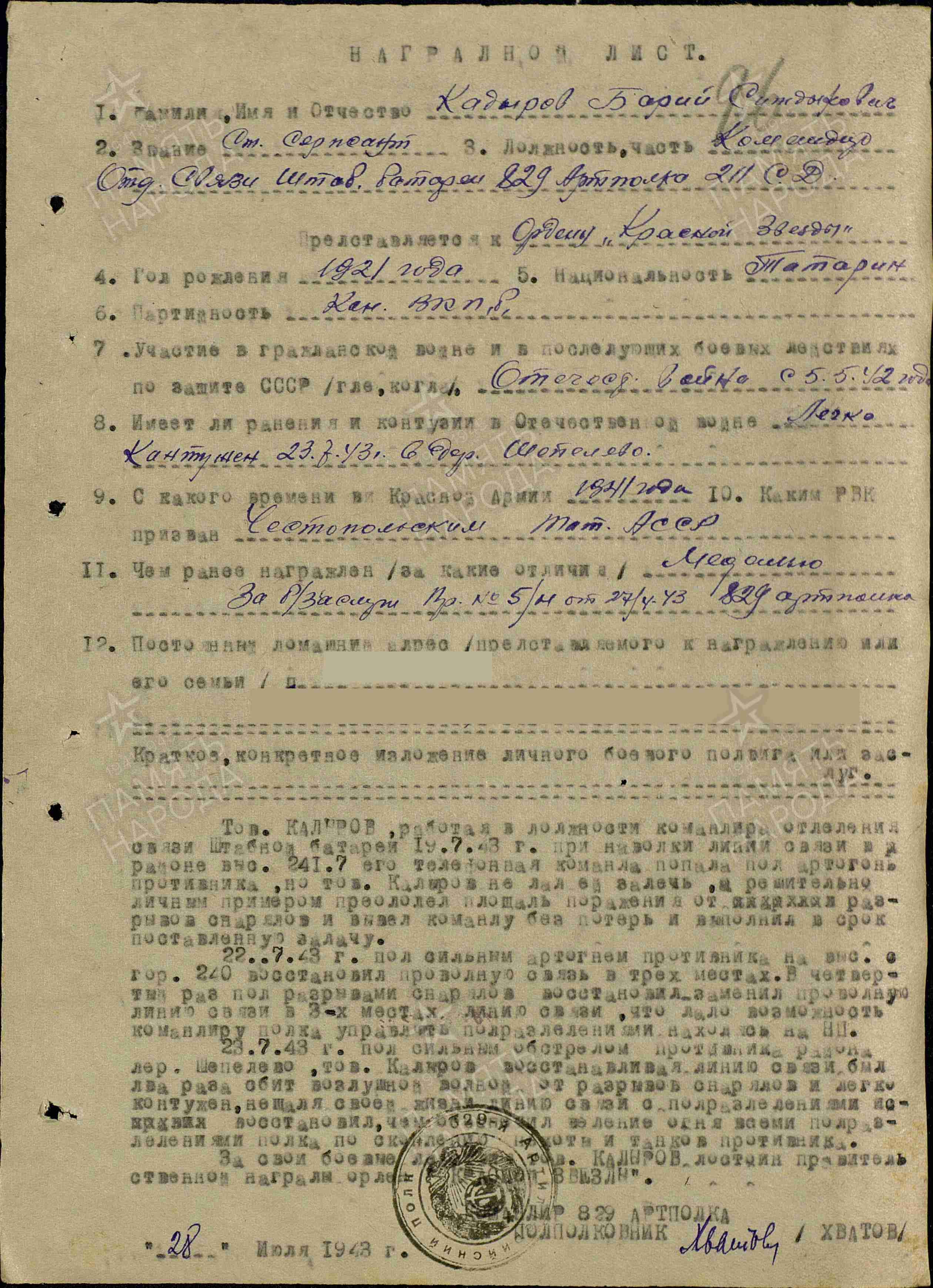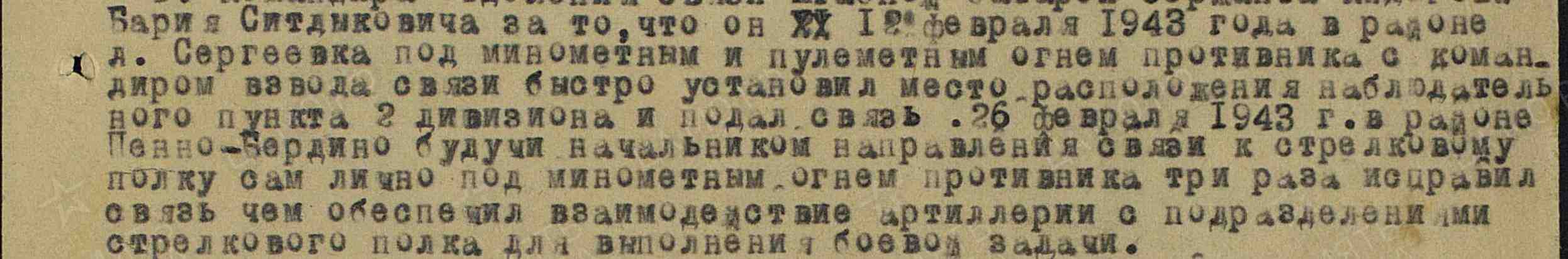 Барий Ситдыкович (Ситдиков) родился 1921 г. в Столбищах Казанской обл. Татарской АССР. В 1941 году был призван в ряды Красной Армии Чистопольским РВК, в Отечественной войне с 5 мая 1942 года. Служил в звании старшего сержанта в должности командира Отделения Связи штаб. Батареи 829 Арт.полка 211 СД. В бою был легко контужен 23.07.1943 г. Был награжден медалями «За боевые заслуги» (27.04.1943), «За отвагу» (12.11.1944), «За победу над Германией в Великой Отечественной войне 1941–1945 гг.» (09.05.1945), орденом Красной Звезды (30.07.1943).