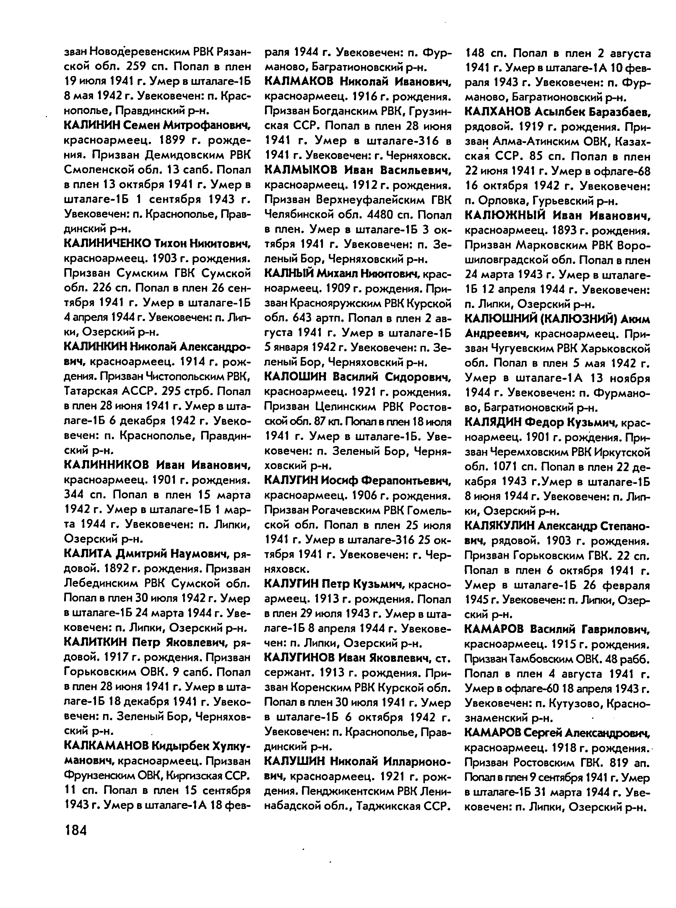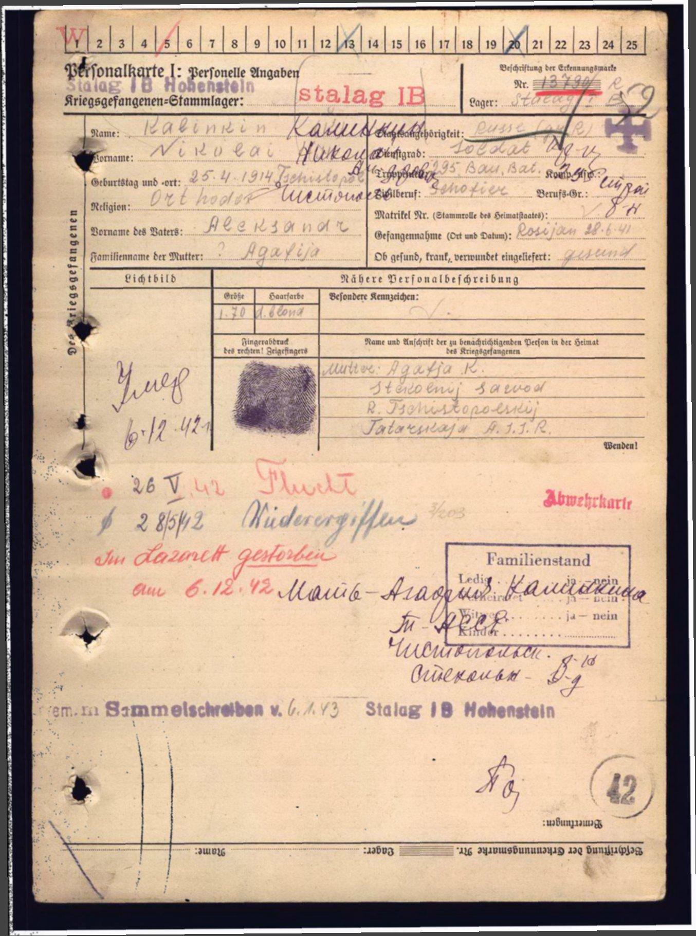 Родился 25 апреля 1914 г. в д. Стёкольный завод Мамадышского уезда Казанской губернии. До войны работал шофёром. В ряды Красной Армии призван 6 апреля 1941 Таканышским РВК (по другим сведениям Юдинским РВК, Мамадышским РВК). Рядовой 295 стрб Калинкин Николай Александрович пленён 28 июня 1941 г. под Россиянами. Содержался в шталаге I B. Лагерный номер 13790. Погиб в плену 6 декабря 1942 г. Захоронен в Хоенштайне.