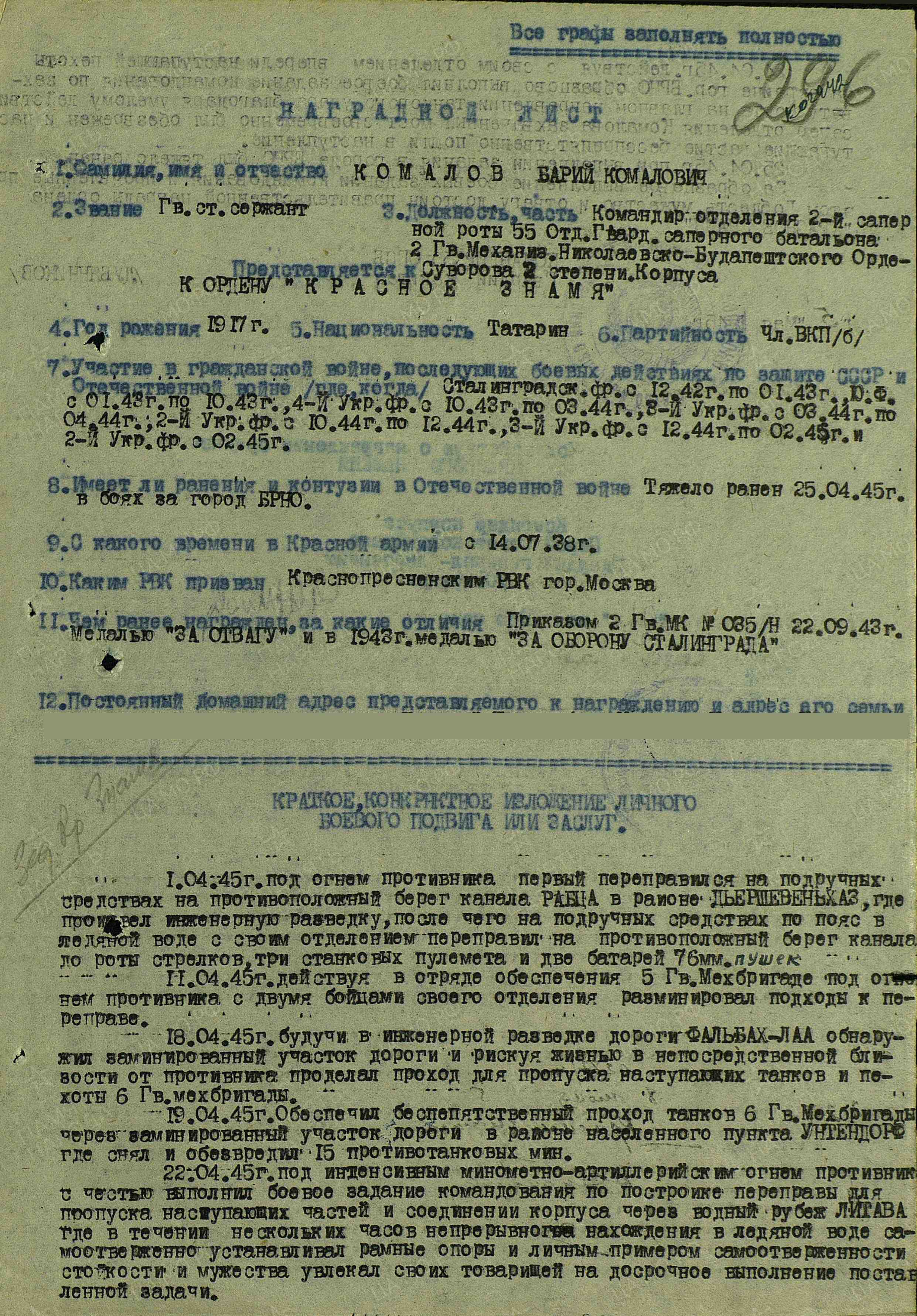 КАМАЛОВ Бари Камалович, 1917, с. Большие Тиганы. Призван в РККА 14 июля 1938 Красно-Пресненским РВК г. Москва. Воевал на Сталинградском, Южном, 4/ 3/ 2 Украинском фронте с дек. 1942. Гв. сержант/ гв. ст. сержант, ком. отделения 55 гв. сапёрного батальона 2 гв. МехК в составе 2 гв. А/ 46А/ 6 гв. ТА. Член ВКП(б). Награждён медалями «За отвагу», «За оборону Сталинграда», орденом Красного Знамени. Тяжело ранен 25 апр. 1945 в боях за г. Брно, Чехословакия.
