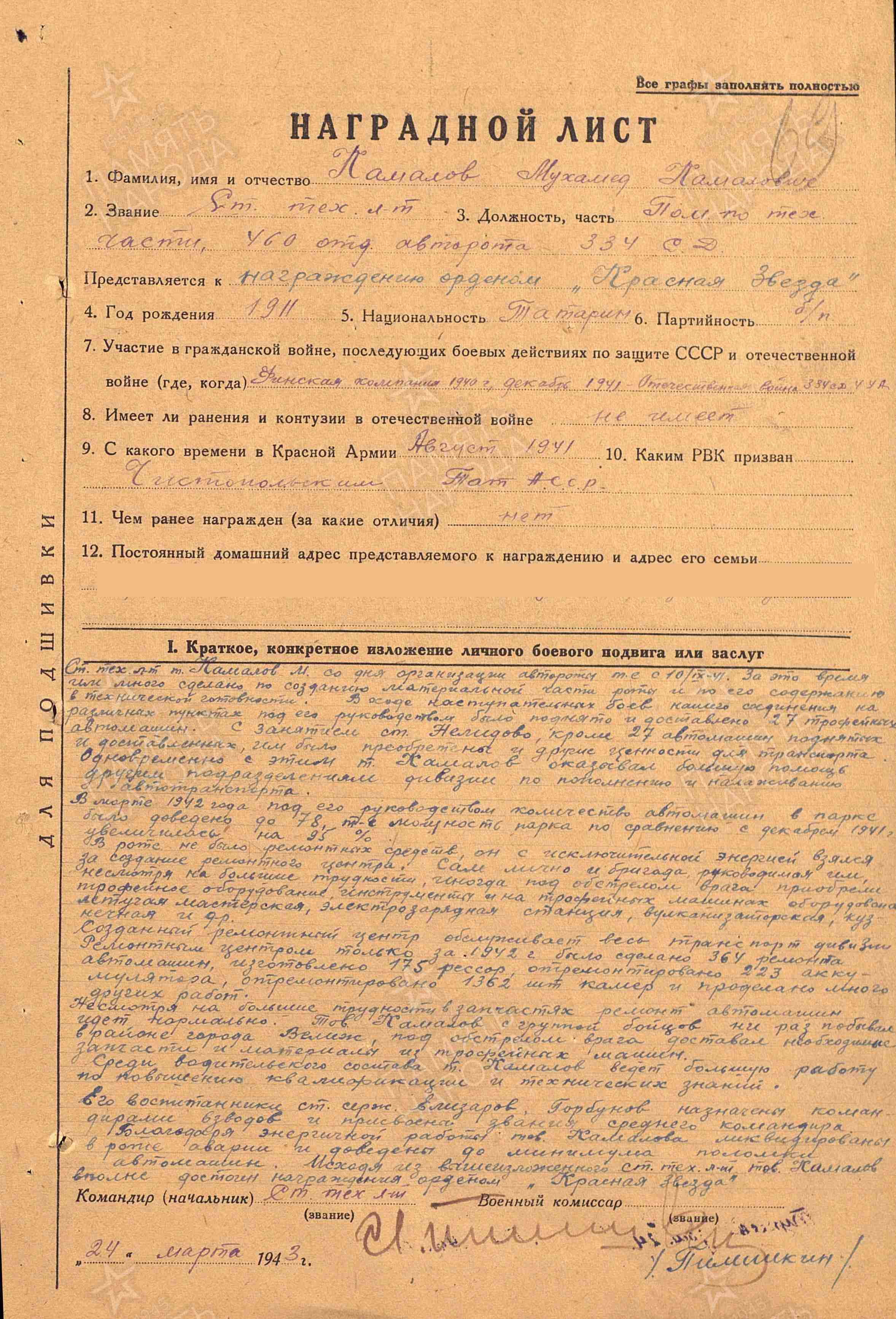 Мухамед Камалович родился 15 февраля 1911 года в г.Чистополе Татарской АССР. В августе 1941 года был призван в ряды Красной Армии Чистопольским ГВК. Служил в звании старший лейтенант, в должности помощник тех.части 460 Отдельной автотранспортной роты 334 Стрелковой дивизии. Был награжден двумя орденами Красной Звезды (01.05.1943) (07.07.1945), орденом Отечественной войны II степени.