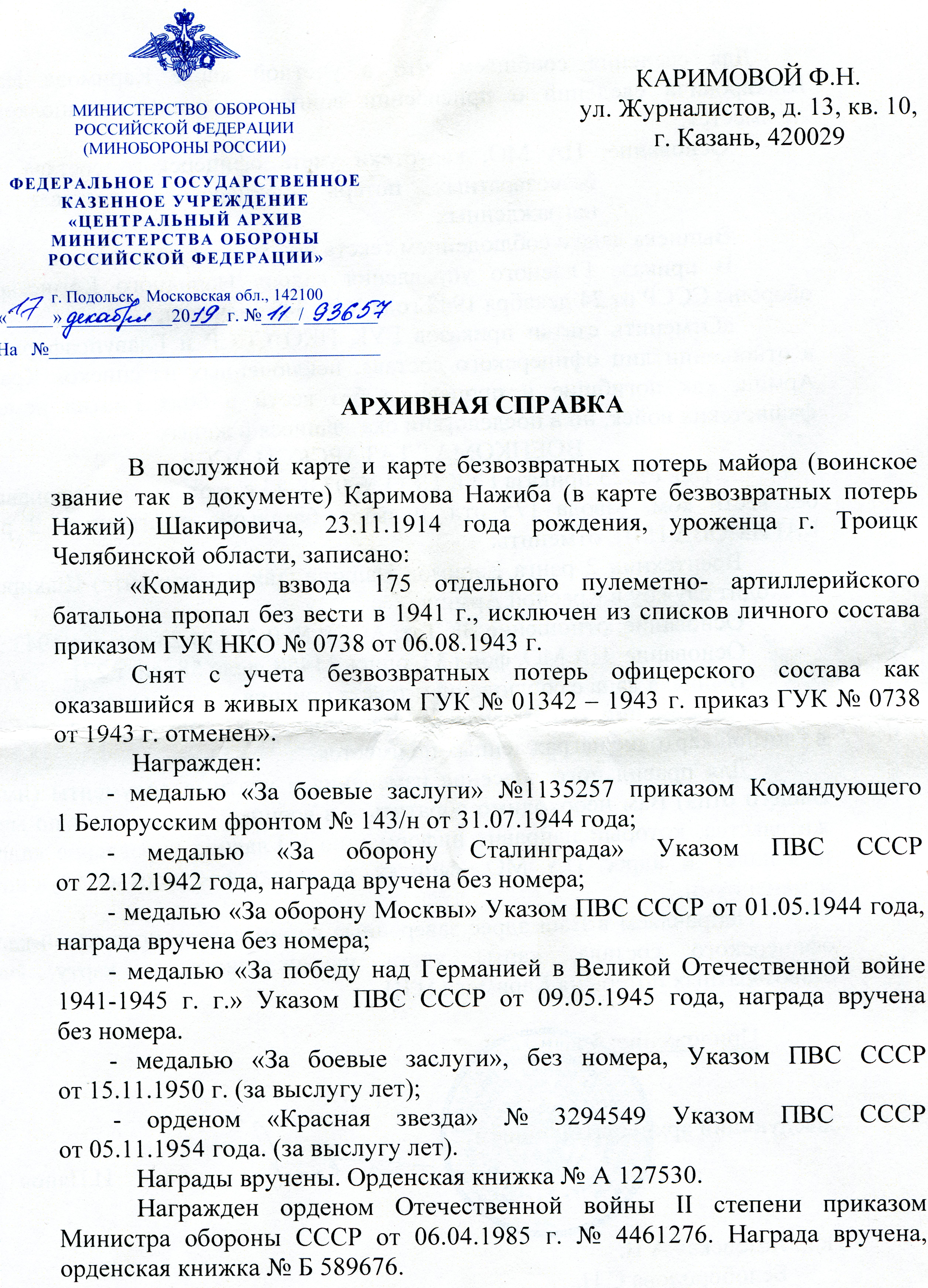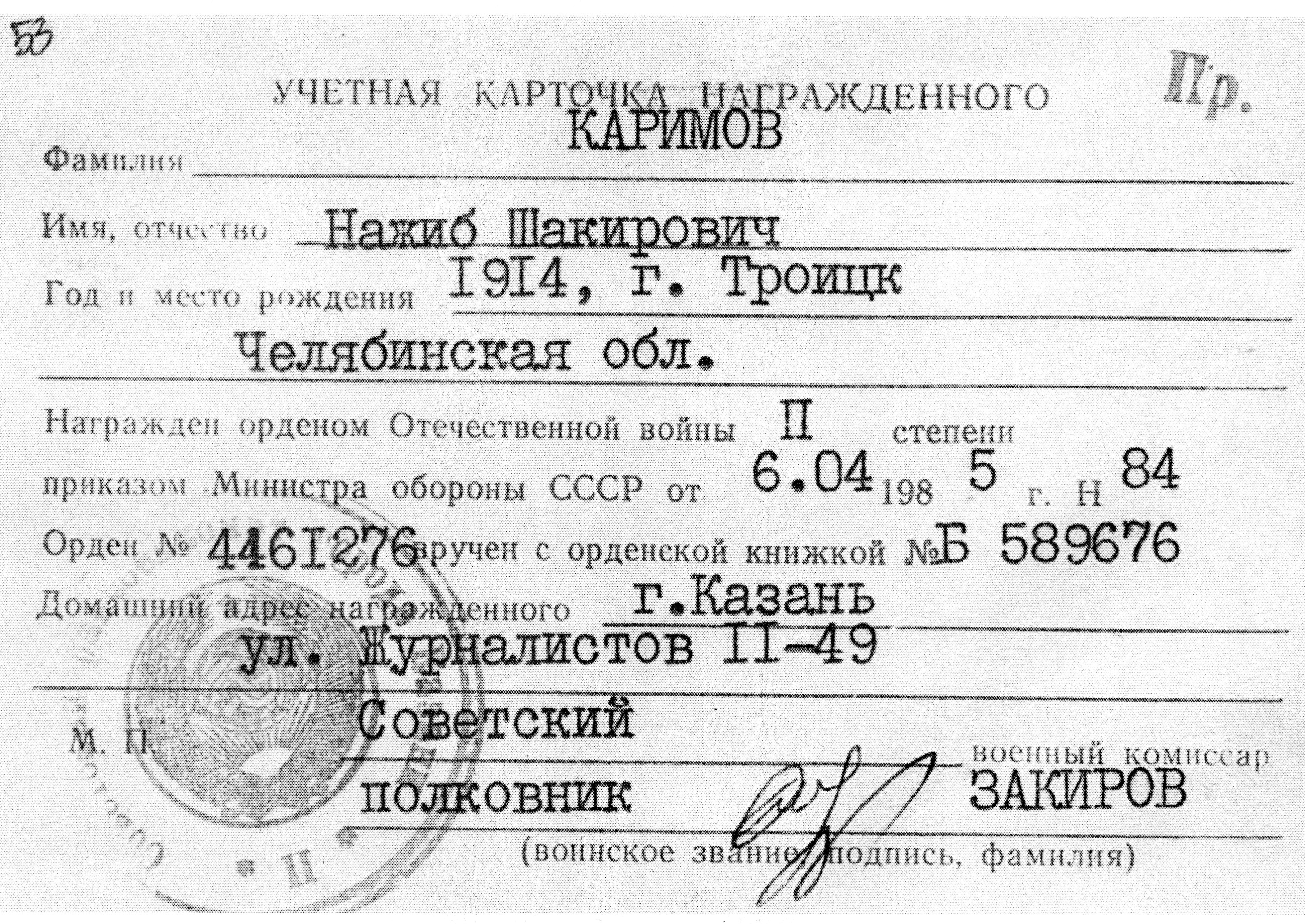 Каримов Нажиб Шакирович родился 23.11.1914г. в г.Троицке Челябинской области, умер 03.08.2002г. в г.Казани. Призван Казанским ГКВ Татарской АССР  г.Казань  1941-06-01. Ст.техник - лейтенант. Участие  на фронтах Великой Отечественной войны:  Западный фронт с 3.07.1941г. по  19.07.1942г.  Западный, Воронежский, Донской, Центральный и 1-й Белорусский фронты с 1.12.1942г. по 9.05.1945г.  Военный билет БМ  063476. Дважды ранен, один раз контужен. Дошел с победой до Берлина. Награжден медалью "За боевые заслуги" 1135257 приказом от 31.07.1944г; медалью "За оборону Москвы" Указом от 01.05.1944г. (без номера); медалью "За победу над Германией " Указом от 09.05.1945г (без номера); медалью "За боевые заслуги" (без номера) Указом от 15.11.1950г. ; орденом "Красная звезда 3294549 Указом от 05.11.1954г.  Орденская книжка 127530. Награжден орденом Отечественной войны II степени приказом от 06.04.1985г. 4461276.  Орденская книжка  Б 589676.