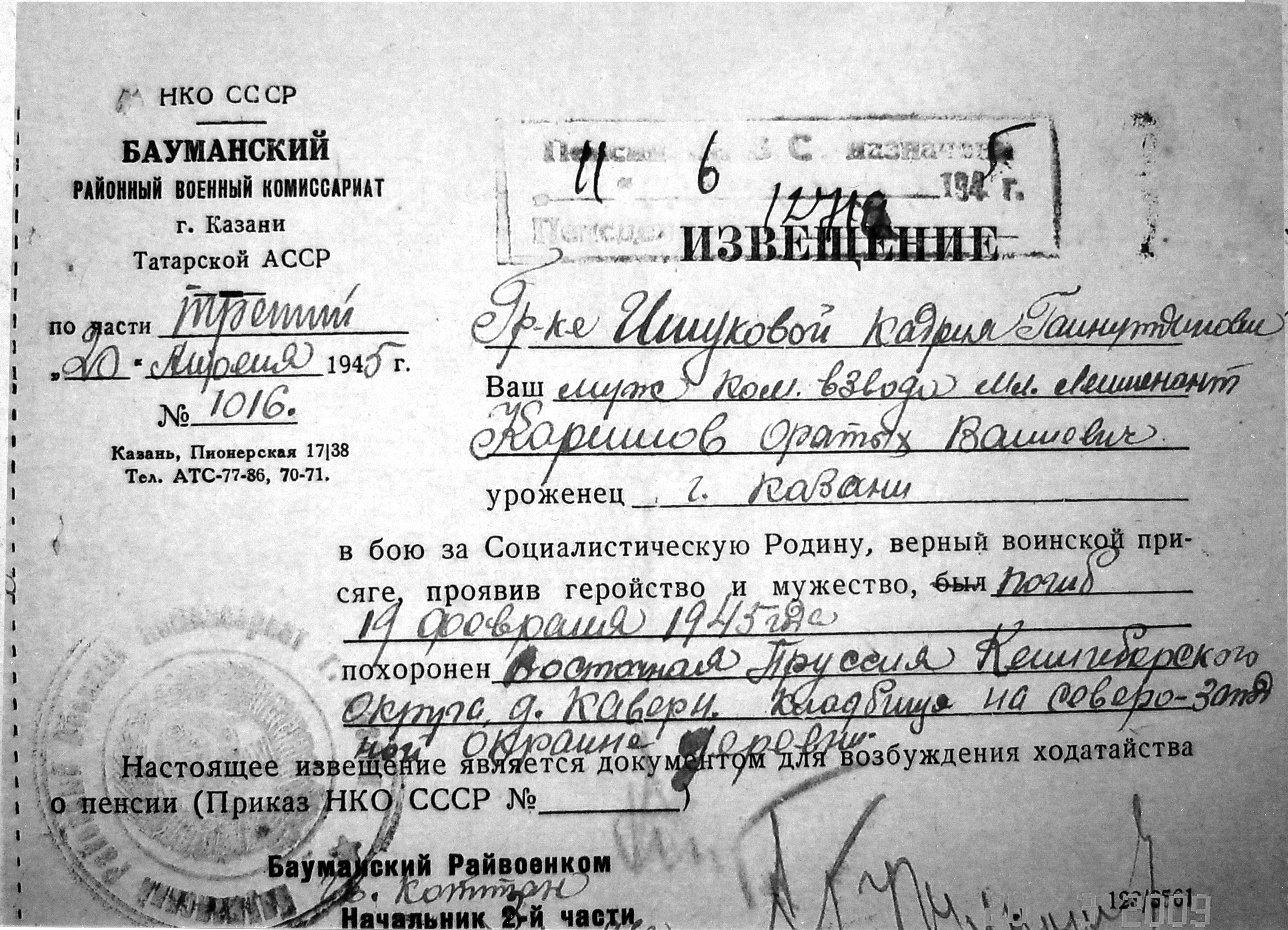 Отец погиб в открытом затяжном бою под Кройцбургом ( около 35-40 км. от Кенигсберга). Этот бой длился почти сутки с 18 по 19 февраля 1945 года. А до этого он участвовал во взятии городов Инстебург, Фридланд, Алленбург. Сохранились «благодарности» Приказом Верховного Главнокомандующего за отличные боевые действия при овладении этими городами – важными, мощными укрепленными районами обороны немцев на путях к Кенигсбергу. «Удостоверения» - командиру саперного взвода лейтенанту Каримову Фатыху Валеевичу в том, что он Приказом по 144 стрелковой Виленской Краснознаменной ордена Суворова дивизии 5-ой Армии 3-его Белорусского фронта от 6 февраля 1945 года награжден орденом «Красная Звезда» и от 12 марта 1945 года – орденом «отечественной войны I степени».