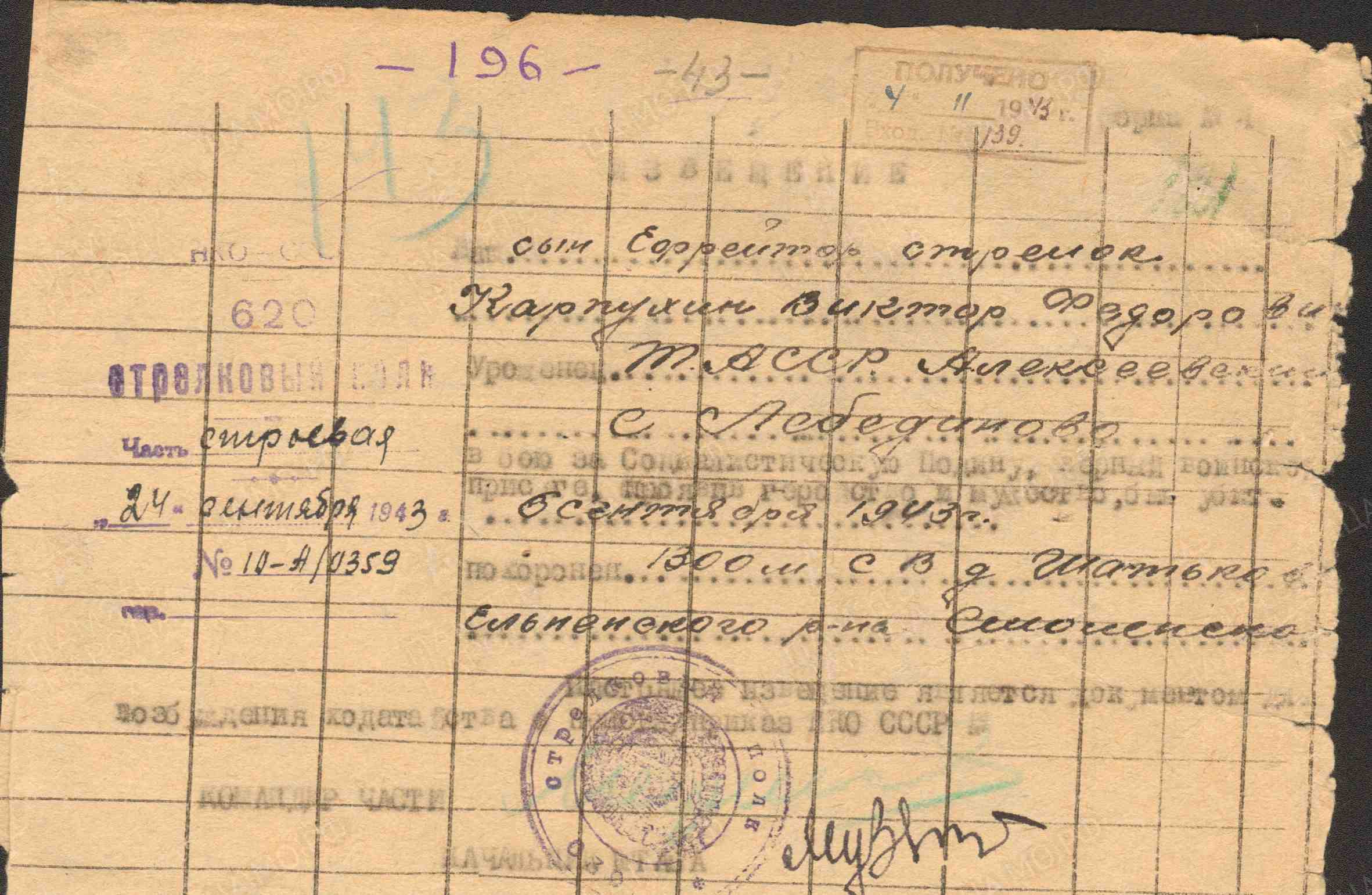 КАРПУХИН Виктор Фёдорович, 1925, с. Лебедино. Член ВЛКСМ. До призыва в армию работал в к-зе «Памяти Куйбышева». Мобилизован в янв. 1943 Алексеевским РВК. Ефрейтор, стрелок 620 СП 164 СД 33 А Западного фронта. Погиб 6 сент. 1943, д. Шатьково, Ельнинский р-н, Смоленская обл. Увековечен в сквере Боевой Славы в г. Ельня.