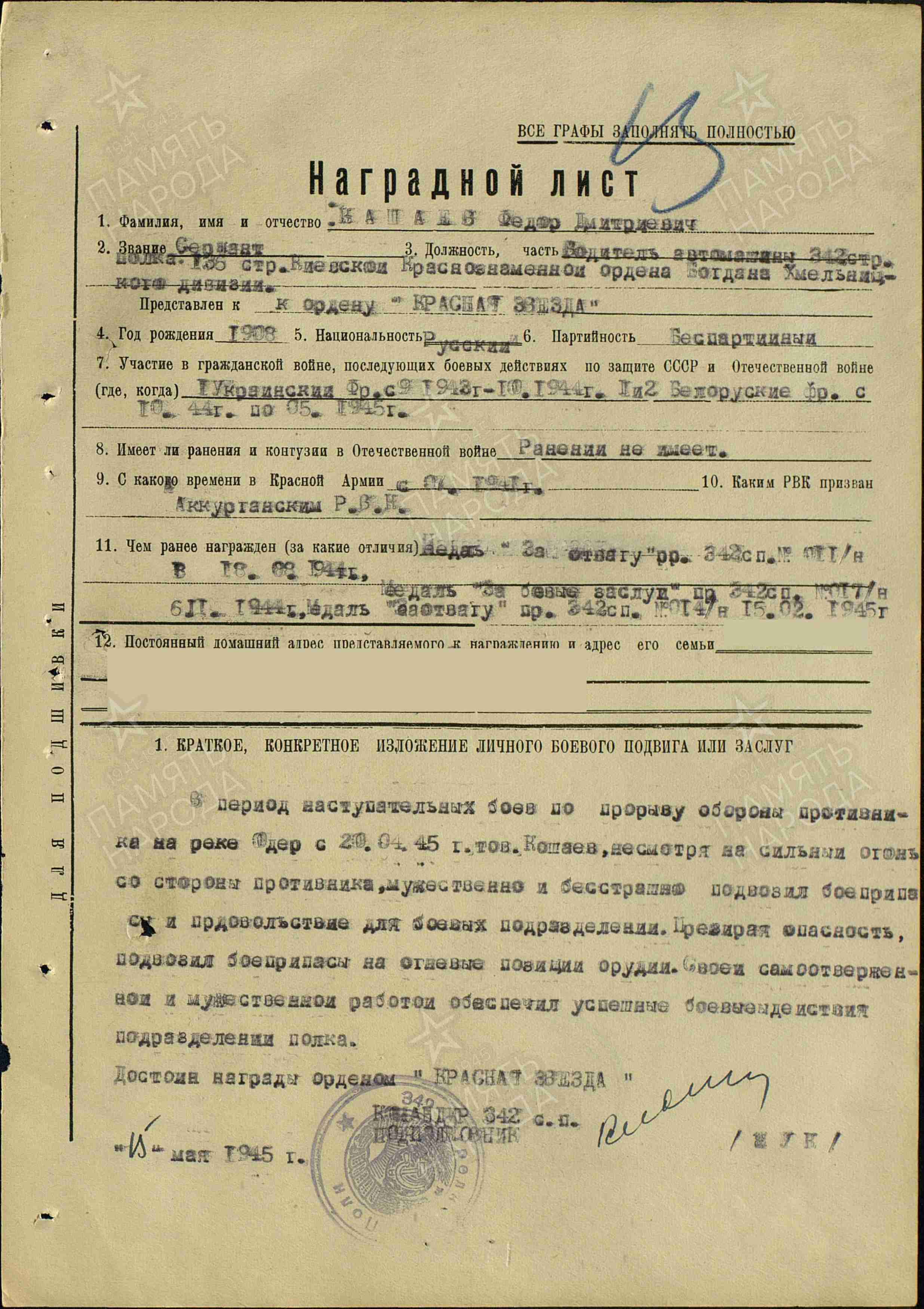 КАШАЕВ (КОШАЕВ) Фёдор Дмитриевич, 1908, д. Фёдоровка. Мобилизован 24 июня 1941 Ак-Курганским РВК Ташкентской обл. Узбекской ССР. Воевал с июня 1942 на Брянском, Воронежском, 1 Украинском, 1 и 2 Белорусском фронте в составе 48 А/ 52 А/ 38 А/ 27 А/ 3 гв. А/ 13 А/ 65 А/ 70 А. Участник освобождения Украины, Польши, форсирования Одера, штурма Берлина. Сержант, шофёр транспортной роты 118 отд. СБр/ 342 СП 136 СД. Награждён двумя медалями "За отвагу", медалями "За боевые заслуги", "За взятие Берлина", орденами Красной Звезды, Отечественной войны 2 ст. (1985). После войны жил в г. Казань.
