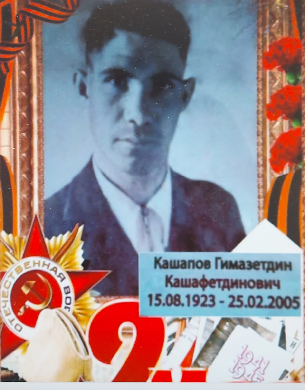 Мой прадедушка – Кашапов Гимазетдин Кашафетдиновичумер 25 февраля 2005 года, к сожалению, я не застала его живым. Своего прадеда. Я считаю героем моего времени. Он как и весь наш народ встал на защиту своей Родины, за честь, за свободубудущего поколения т. е. меня, моих родителей, моих друзей, за всех ныне живущих!
