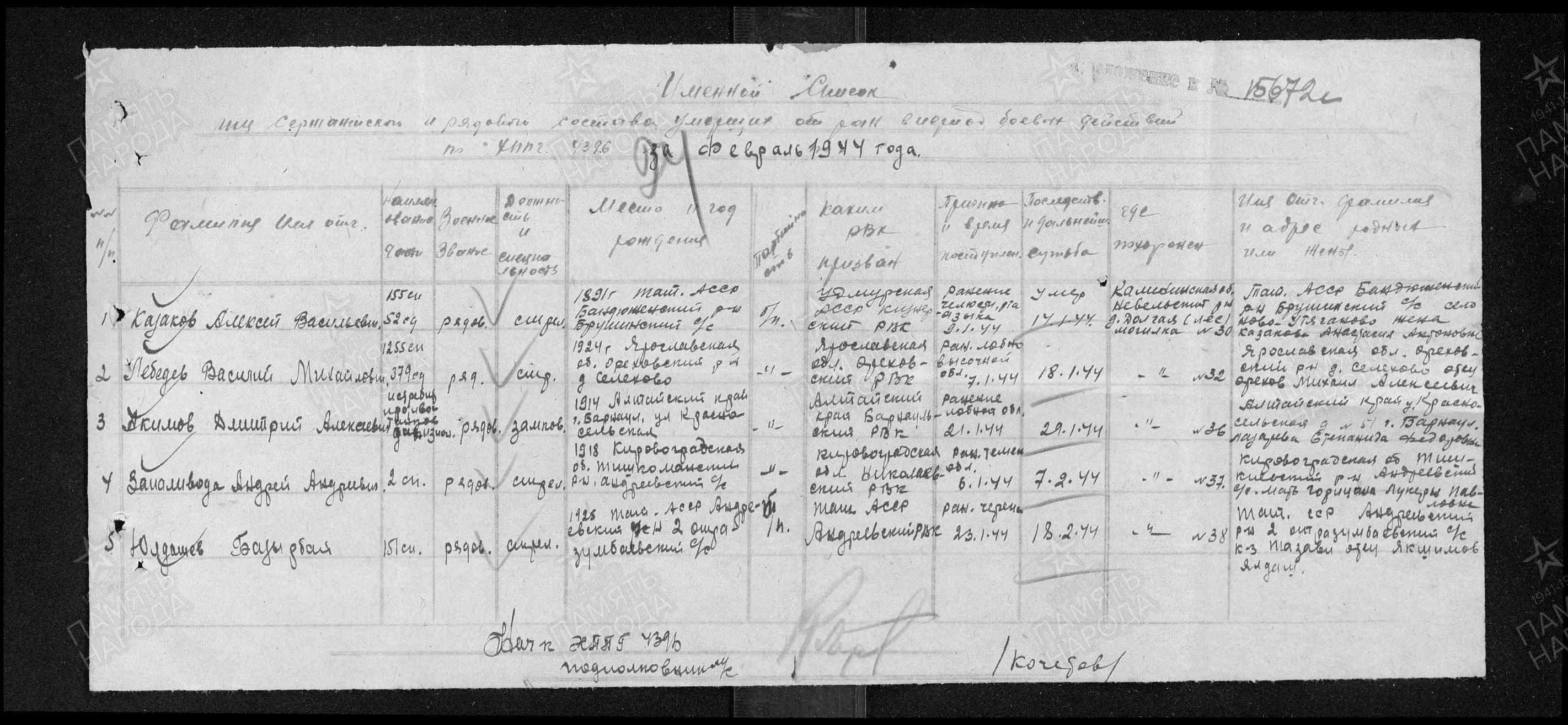 Год рождения 1891, Татарская АССР, Бондюжский р-н, Брюшлинский с/с. Мобилизован Кизнерским РВК, Удмуртская АССР 17.3.1942 г. Последнее место службы: 6 гваврдейская армия, 155 стрелковый полк, 52 стрелковая дивизия. 155 стрелковый полк 14 стрелковой дивизии. Рядовой, 9.1.1944 был ранен. Умер от ран 14.01.1944 г. Первичное место захоронения Калининская обл., Невельский р-н, д. Долгая, лес, могила № 30. Жена Анастасия Антоновна, Новое Утяганово, Брюшлинский сельсовет.