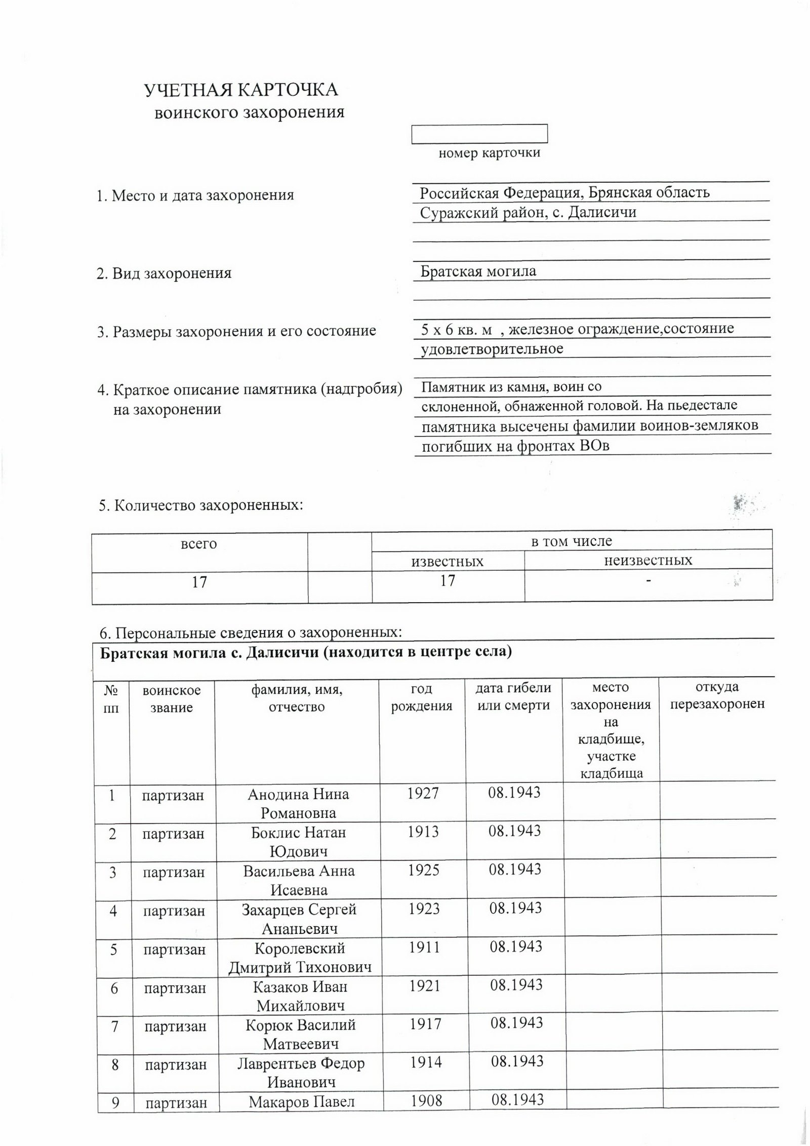 Погиб в августе 1943 года, похоронен с 16-ю товарищами в с.Далисичи, Суражский район, Брянской области.