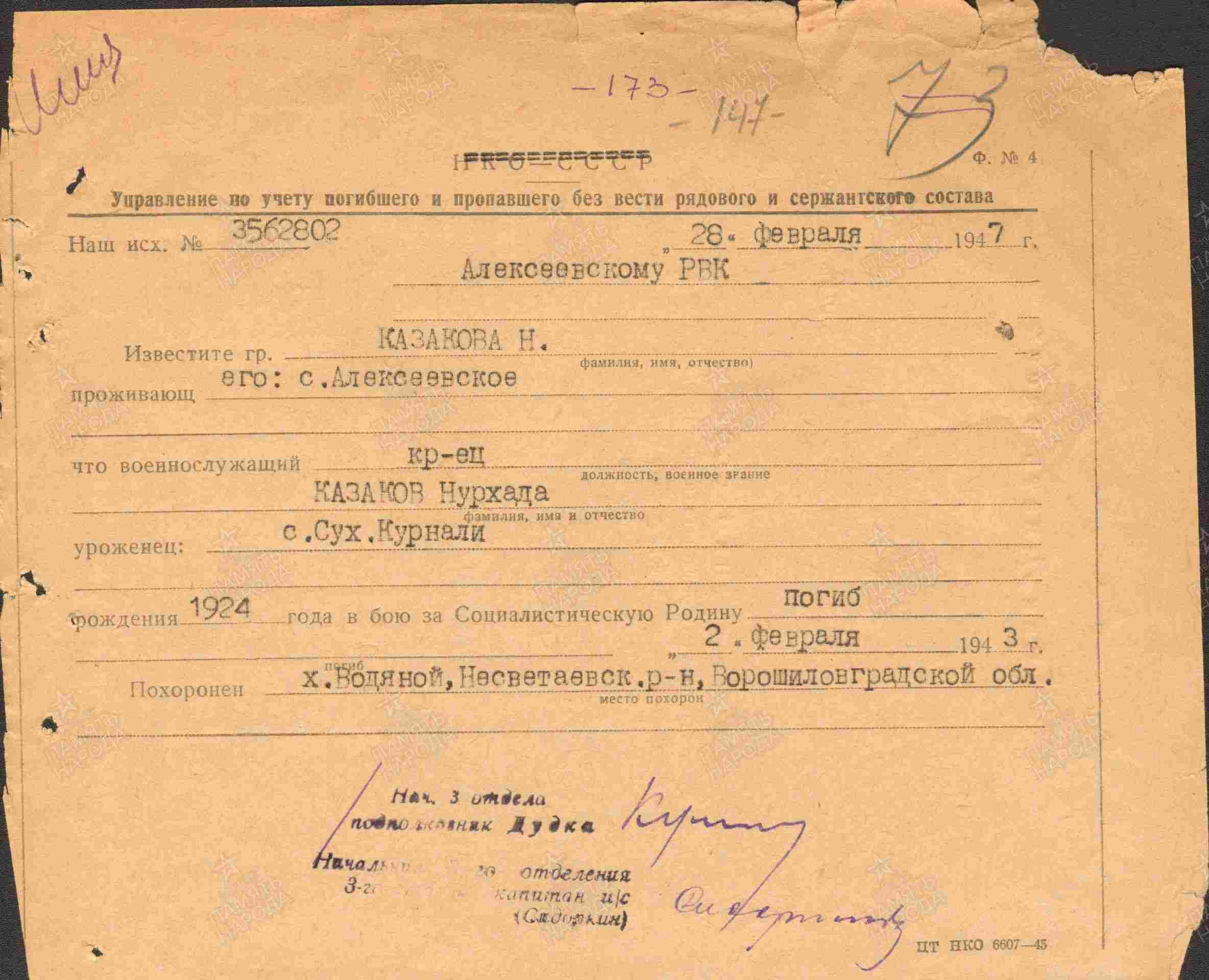 КАЗАКОВ Нурхада Нуретдинович (Нуреевич), 1924, с. Сухие Курнали. Мобилизован Алексеевским РВК 22 авг. 1942. Гв. красноармеец, миномётчик 1 гв. МехБр 1 гв. МехК 1 гв. А/ 3 гв. А Юго-Западного фронта. Погиб 2 фев. 1943, хут. Водяной, Новосветловский р-н (с/с), Ворошиловградская (Луганская) обл., УкрССР.