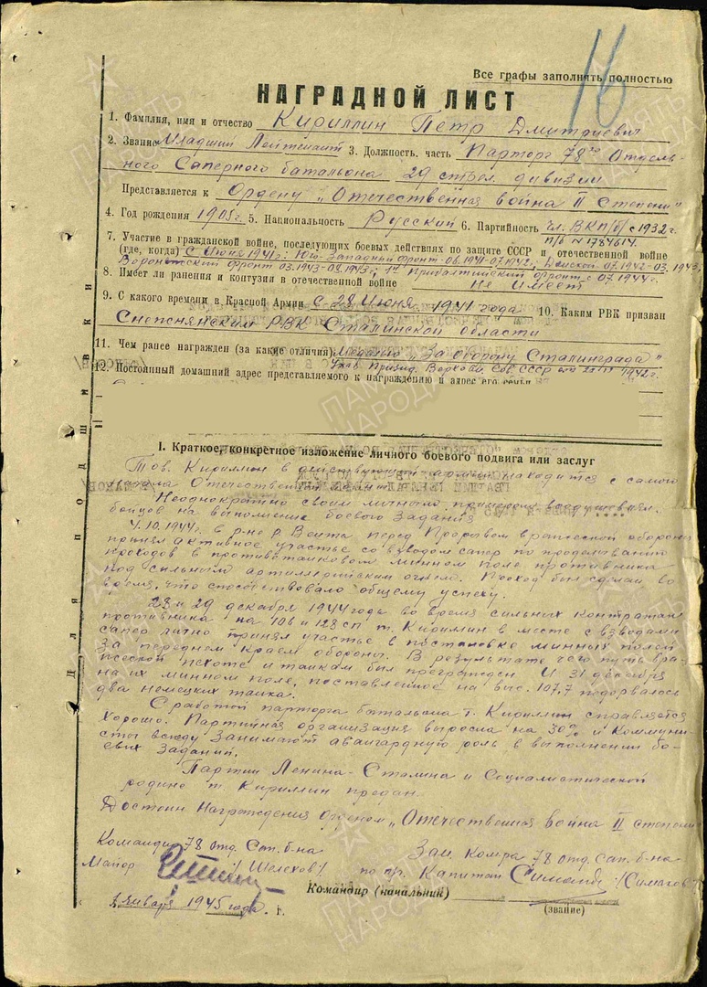 Воинская часть: 78 отдельный саперный батальон 29 стрелковой дивизии (III) Прибалтийского фронта.