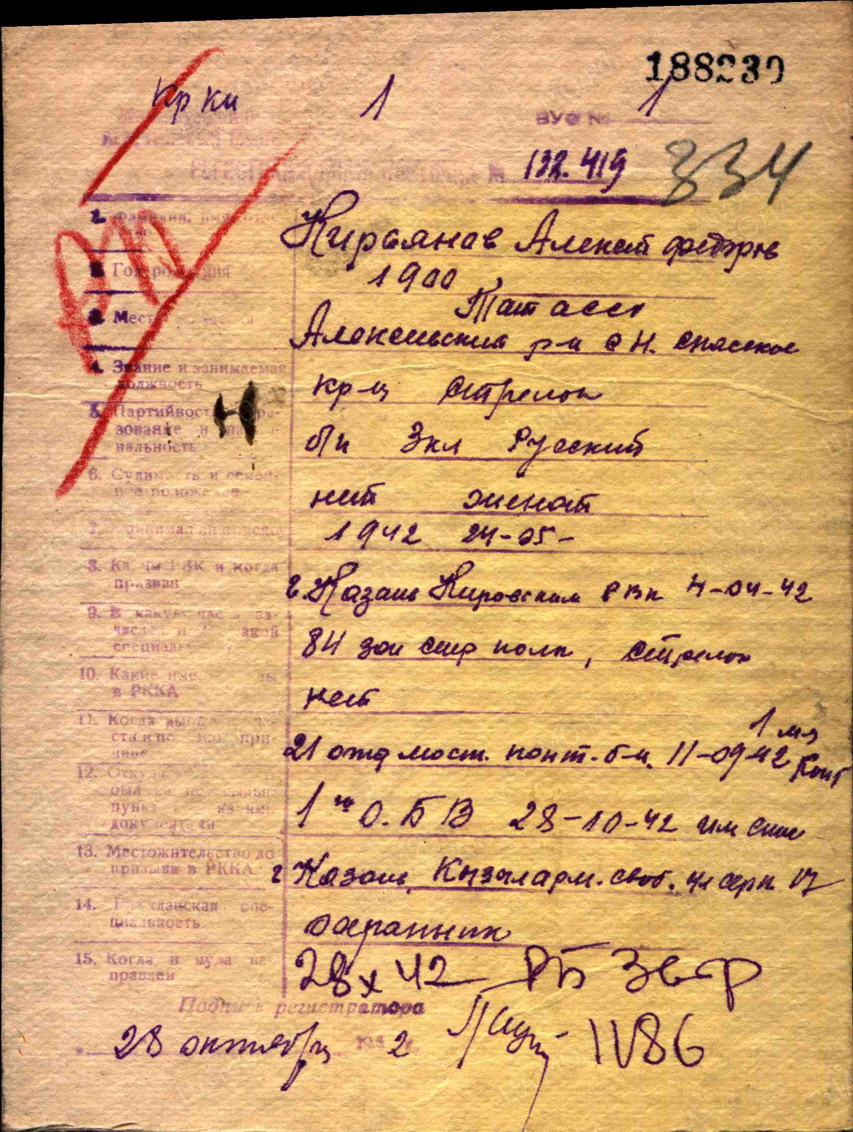 КИРЬЯНОВ Алексей Фёдорович, 1900, с. Новоспасск. Участник Гражданской войны в 1919-1921. Мобилизован 4 апр. 1942 Кировским РВК г. Казань. Красноармеец. Воевал в составе 21 отд. мостового понтонного батальона, 482 СП 131 СД, 255 СП 123 СД, 160 СП 224 СД, 1248 СП 376 СД, 86 СД различных армий Ленинградского фронта. В 1942-1943 перенёс три ранения. Ошибочно учтён пропавшим без вести в июле 1943. Проходил лечение в АрмГЛР 2583 55 А, ЭГ 1015, ЭГ 1170, г. Ленинград. Награждён медалью «За оборону Ленинграда».