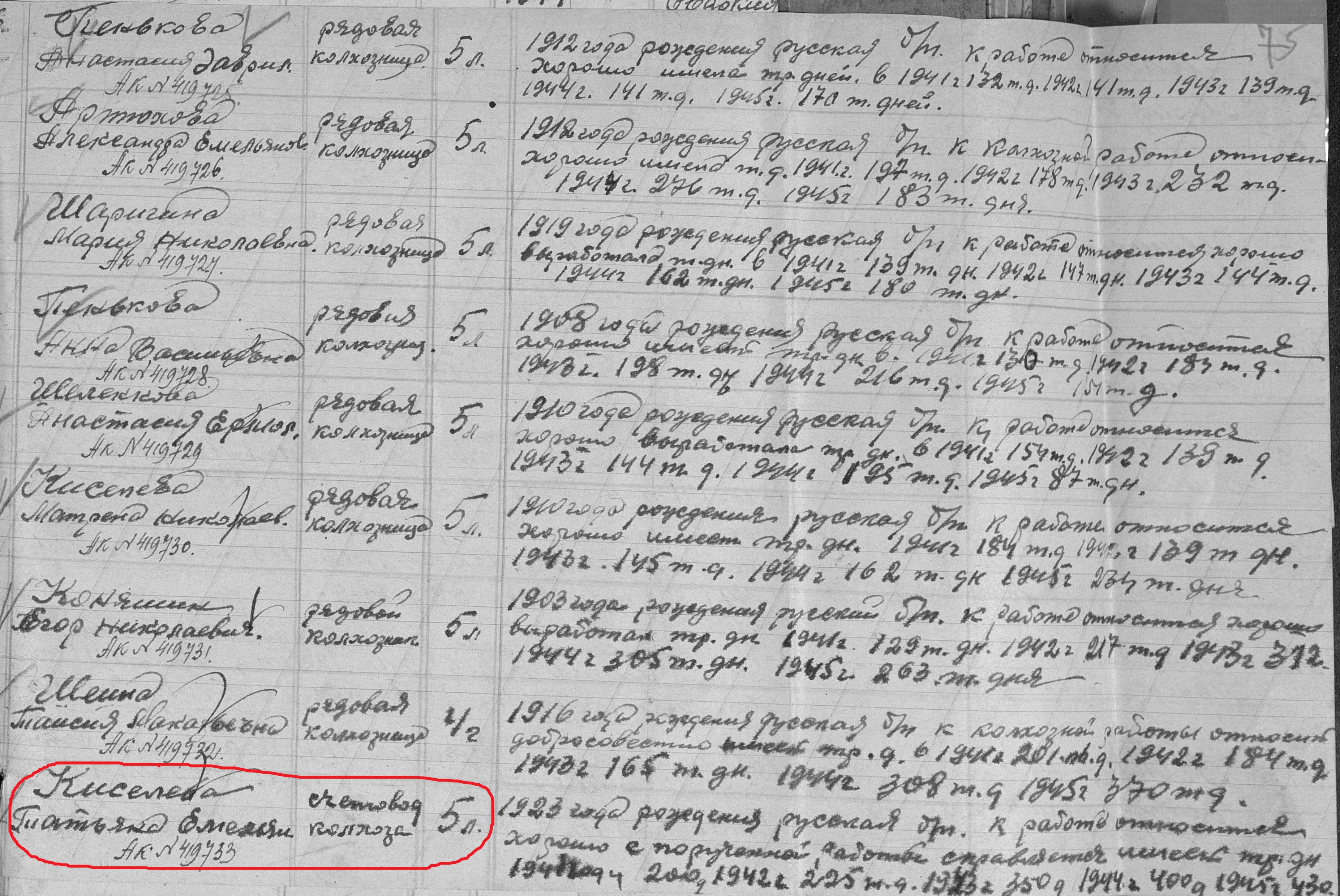 Киселева Татьяна Емельяновна родилась в 1923 году. Место жительства: д.Дальняя Ивановка Ново-Шешминский район ТАССР (ныне Альметьевский район РТ). В годы Великой Отечественной войны работала в колхозе им.Буденого рядовой колхозницей. Награждена медалью "За доблестный труд в Великой Отечественной войне 1941–1945 гг." (Акт от 28 апреля 1947 г, фонд 3610, опись 2, дело № 325, лист 74, № 419833).