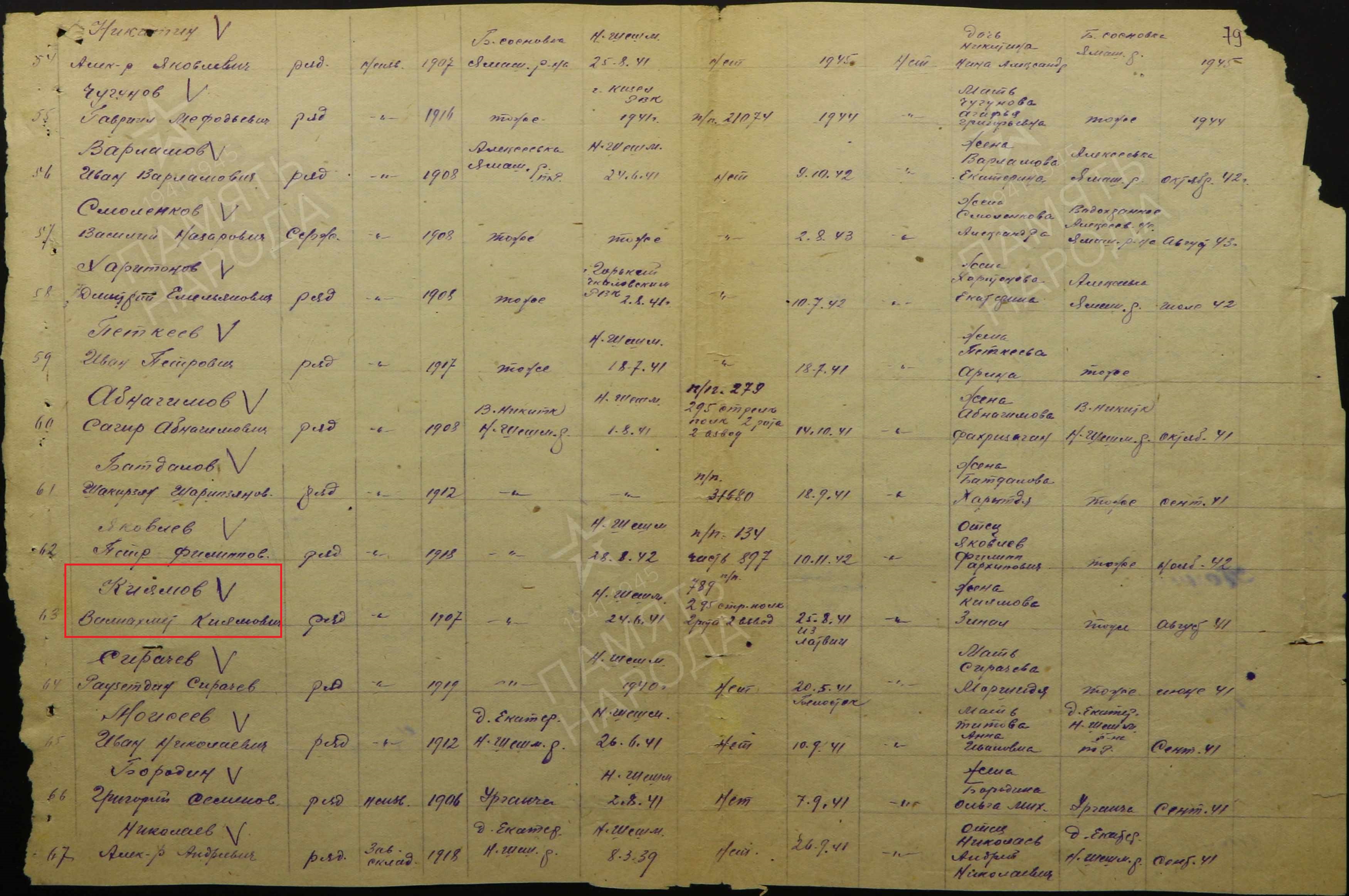 КИЯМОВ ВАЛИАХМЕТ КИЯМОВИЧ родился в 1907 году в с.Верхнее Никиткино Казанской губернии Чистопольского уезда Ерыклинской волости (ныне с. Тубылгы-Тау Новошешминского района РТ). Мобилизован Новошешминским РВК,кр-ц,295 сп,183 сд. Пропал без вести: 08.41 г. Область выбытия: Новгородская обл., Старорусский р-н