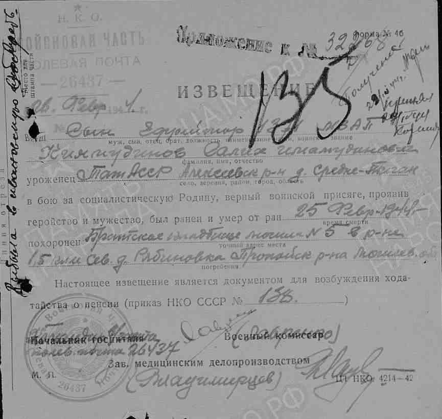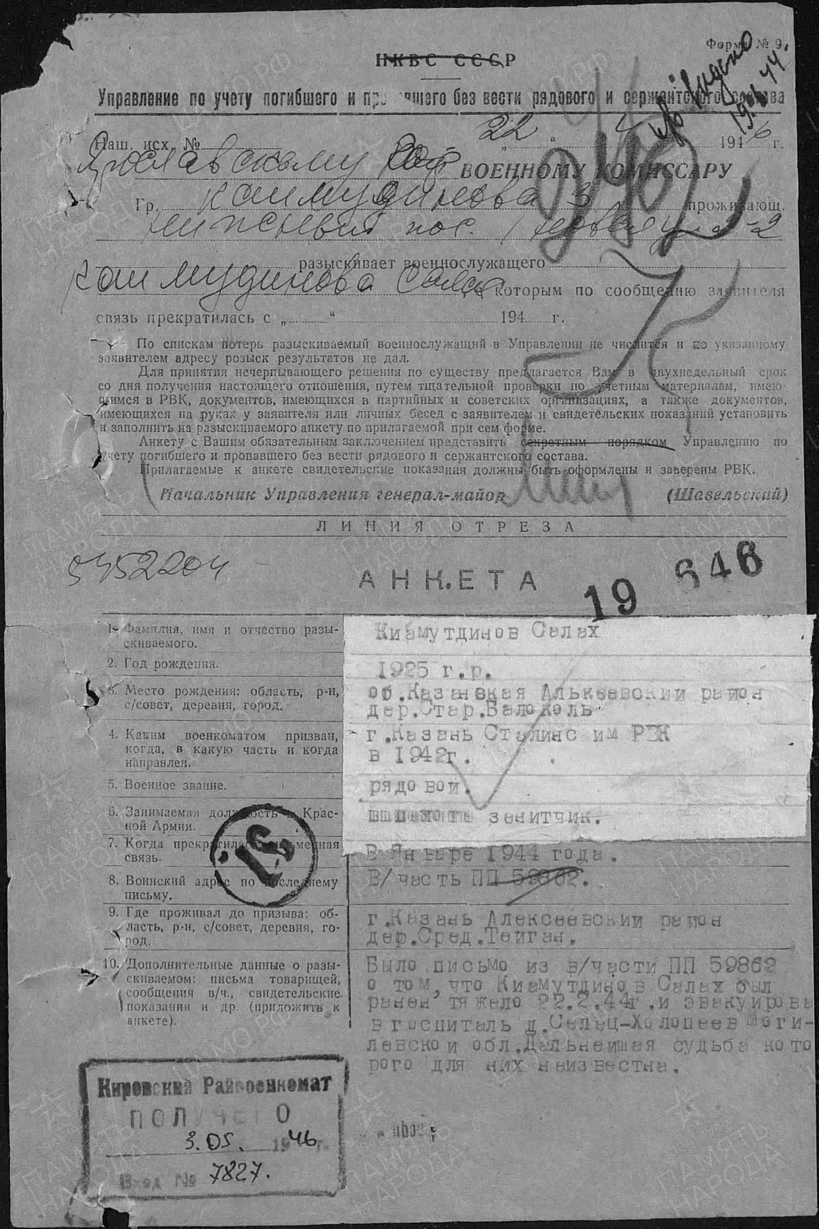 КИЯМУТДИНОВ Салах (Салих) Имамутдинович, 1925, с. Старый Баллыкуль, Алькеевский р-н. Жил в с. Средние Тиганы. Мобилизован в 1942 Сталинским РВК г. Казань. Ефрейтор, орудийный номер 1371 ЗенАП 63 А/ 61 А Брянского/ Белорусского фронта. Участник битвы на Курской дуге и освобождения Белоруссии. Тяжело ранен 22 фев. 1944 и эвакуирован в ХППГ 2233. Умер от ран 25 фев. 1944, с. Рябиновка, Пропойский (Славгородский) р-н, Могилёвская обл., БелССР.