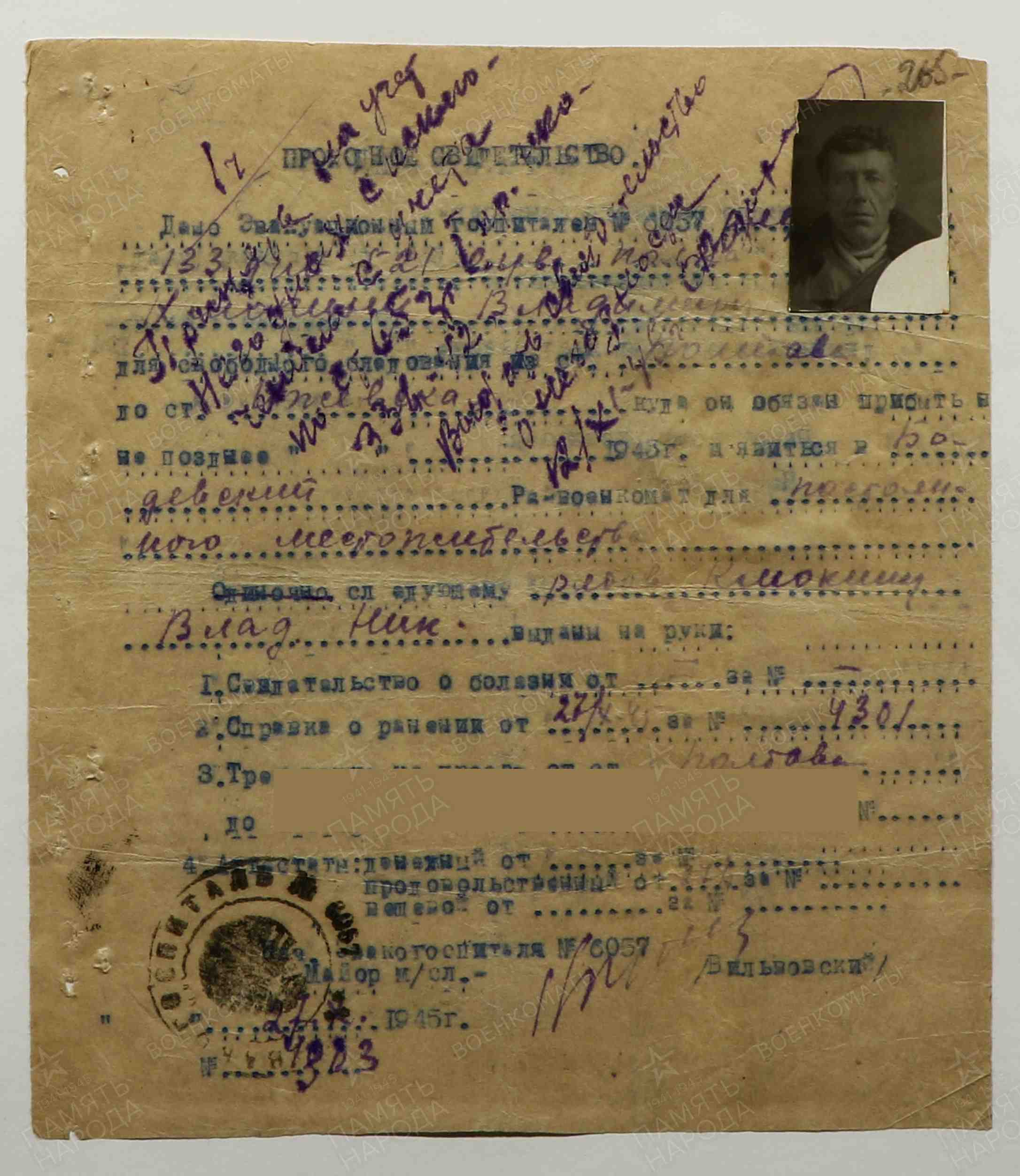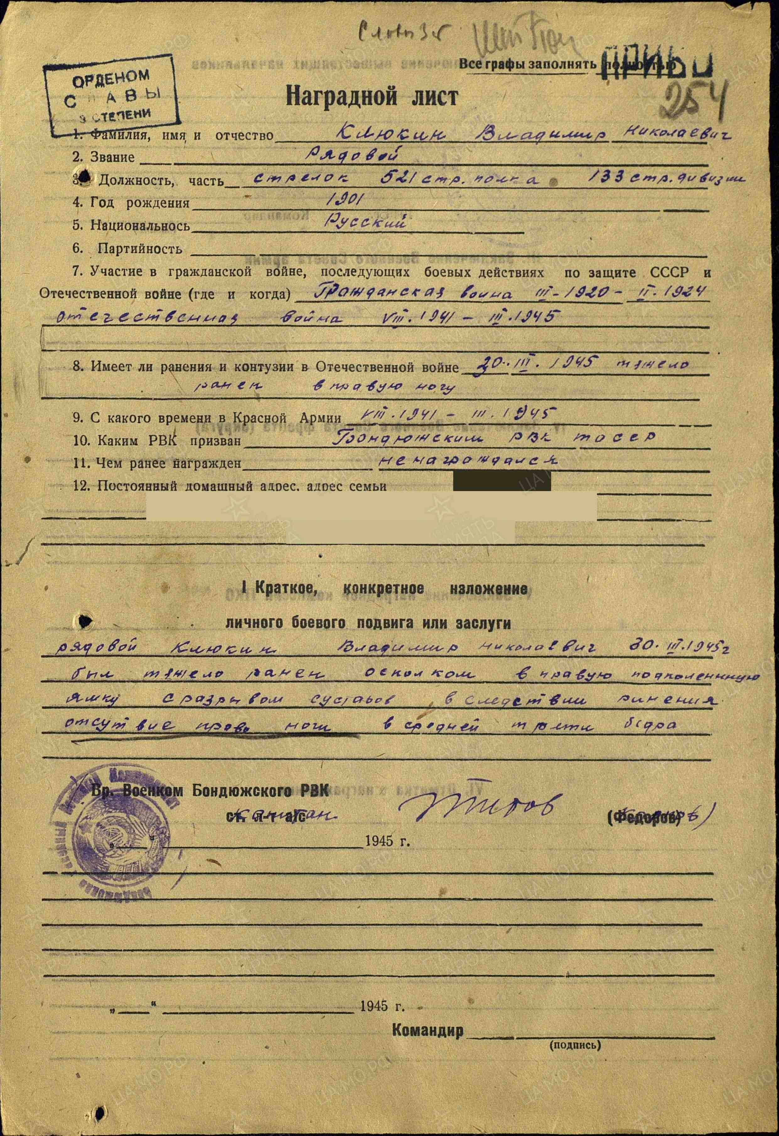 Красноармеец, стрелок 521 стрелкового полка 133 стрелковой дивизии. 10 мотострелковый корпус, 187 мотострелковая бригада. Брянский, западный, второй Украинский фронт. Имеет три ранения, два тяжелых. В марте 1945 г. вследствие тяжелого осколочного ранения потерял ногу.