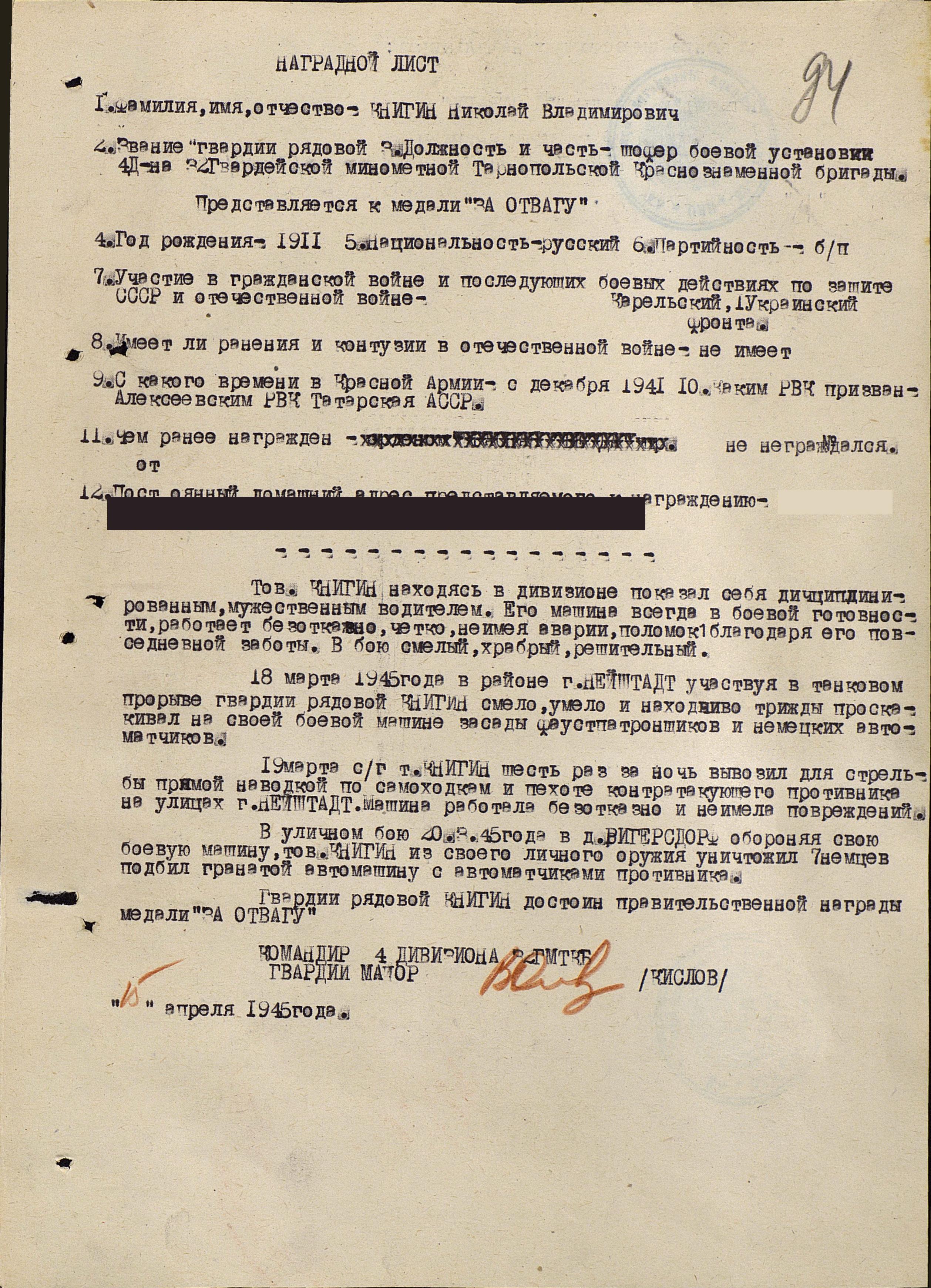 КНИГИН Николай Владимирович, 1911, с. Большой Красный Яр. Мобилизован Алексеевским РВК 4 дек. 1941. Воевал на Карельском фронте с апр. 1942, с дек. 1943 - на 1 Украинском фронте в составе 7 АртК прорыва РГК/ 60 А/ 21 А/ 5 гв. А/ 6 А. Гв. красноармеец, шофёр транспортной и боевой машины 32 гв. МинБр реактивной артиллерии 3 гв. МинД. Участник освобождения Украины, Польши, штурма Берлина. Награждён медалями "За отвагу", "За взятие Берлина", орденом Красной Звезды. Демобилизован в 1945. Умер в 1959.