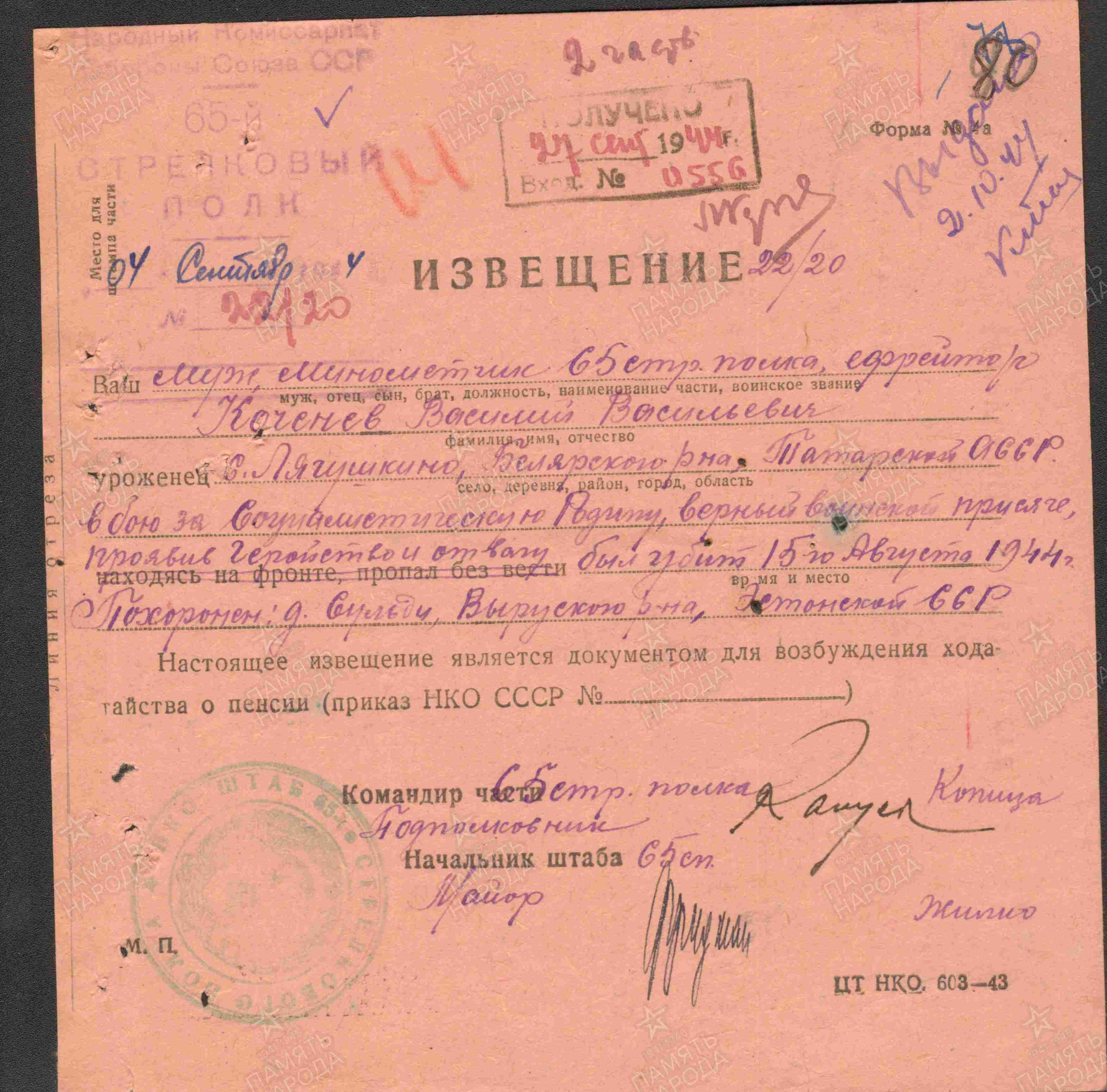 КОЧАНОВ (КОЧЕНЕВ) Василий Васильевич, 1907, д. Лягушкино. Мобилизован Билярским РВК 7 окт. 1941. Воевал на Ленинградском фронте в составе 55 А/ 67 А/ 2 УдА/ 59 А/ 8 А. Участник прорыва и снятия блокады Ленинграда, освобождения Прибалтики. Ефрейтор, миномётчик 65 СП 43 А. Награждён медалями «За оборону Ленинграда», «За отвагу». Погиб 15 авг. 1944, д. Сульби, уезд Вырумаа, Эстонская ССР.