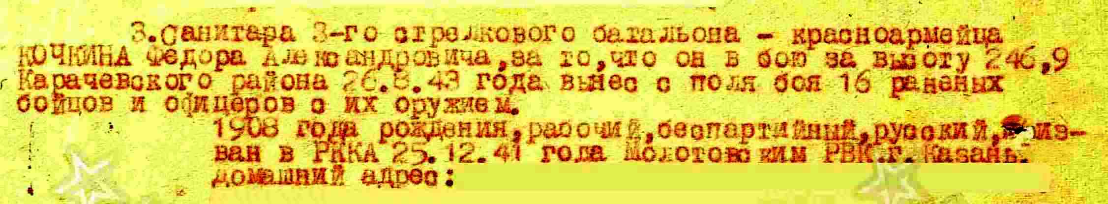 КОЧКИН Фёдор Александрович, 1908, с. Новоспасск. Мобилизован 25 дек. 1941 Молотовским РВК г. Казань. Воевал на Западном и Брянском фронте в составе 50 А/ 49 А/ 11 гв. А. Участник битвы на Курской дуге (северный фас, наступательный этап), освобождения Белоруссии. Красноармеец/ гв. красноармеец, санинструктор 608 СП 146 СД/ 40 гв. СП 11 гв. СД. Перенёс два тяжёлых ранения: 23 марта 1943, 29 окт. 1943. В бою 26 авг. Вынес с поля боя 16 раненых бойцов и офицеров с их оружием. Проходил лечение в ЭГ 1381, г. Калуга, ЭГ 3866, г. Свердловск, ЭГ 2478, г. Орёл. После второго ранения служил в 227 отд. рабочем (строительном) батальоне. Демобилизован 26 дек. 1945. Награждён медалью «За боевые заслуги».