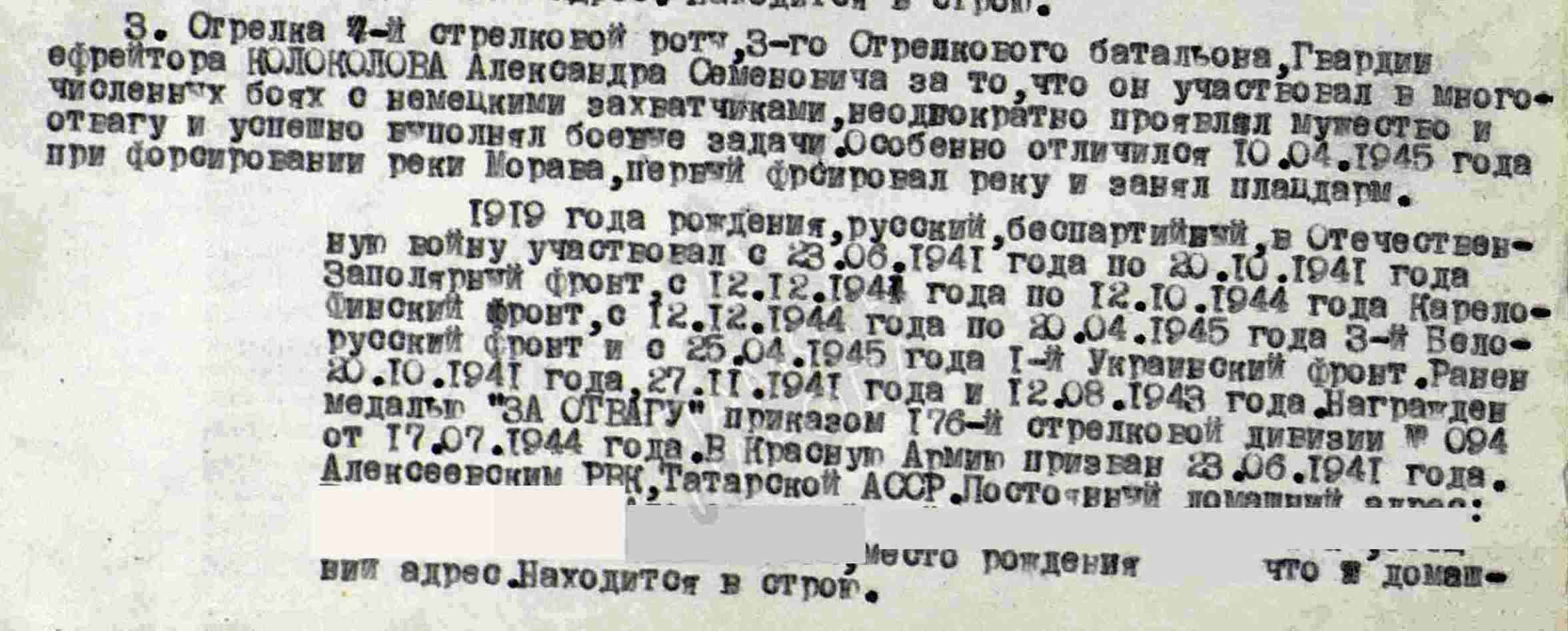 КОЛОКОЛОВ Александр Семёнович, 1919, с. Лебедино/ п. Шалбы. Призван Алексеевским РВК 2 июня 1941. Воевал на Карельском, 3 Белорусском, 2 Украинском фронте в составе 32 А/ 5 А/ 7 гв. А. В боях перенёс три ранения: 20 окт. 1941, 27 нояб. 1941, 12 авг. 1943. Красноармеец/ ефрейтор/ гв. ефрейтор, пулемётчик 75 отд. стрелкового батальона/ 65 отд. морской СБр/ стрелок комендантского взвода управления 176 СД/ стрелок 17 гв. ВДСП 6 гв. ВДД. Участник освобождения Польши и Чехословакии. Награждён медалью «За оборону Советского Заполярья», двумя медалями «За отвагу».