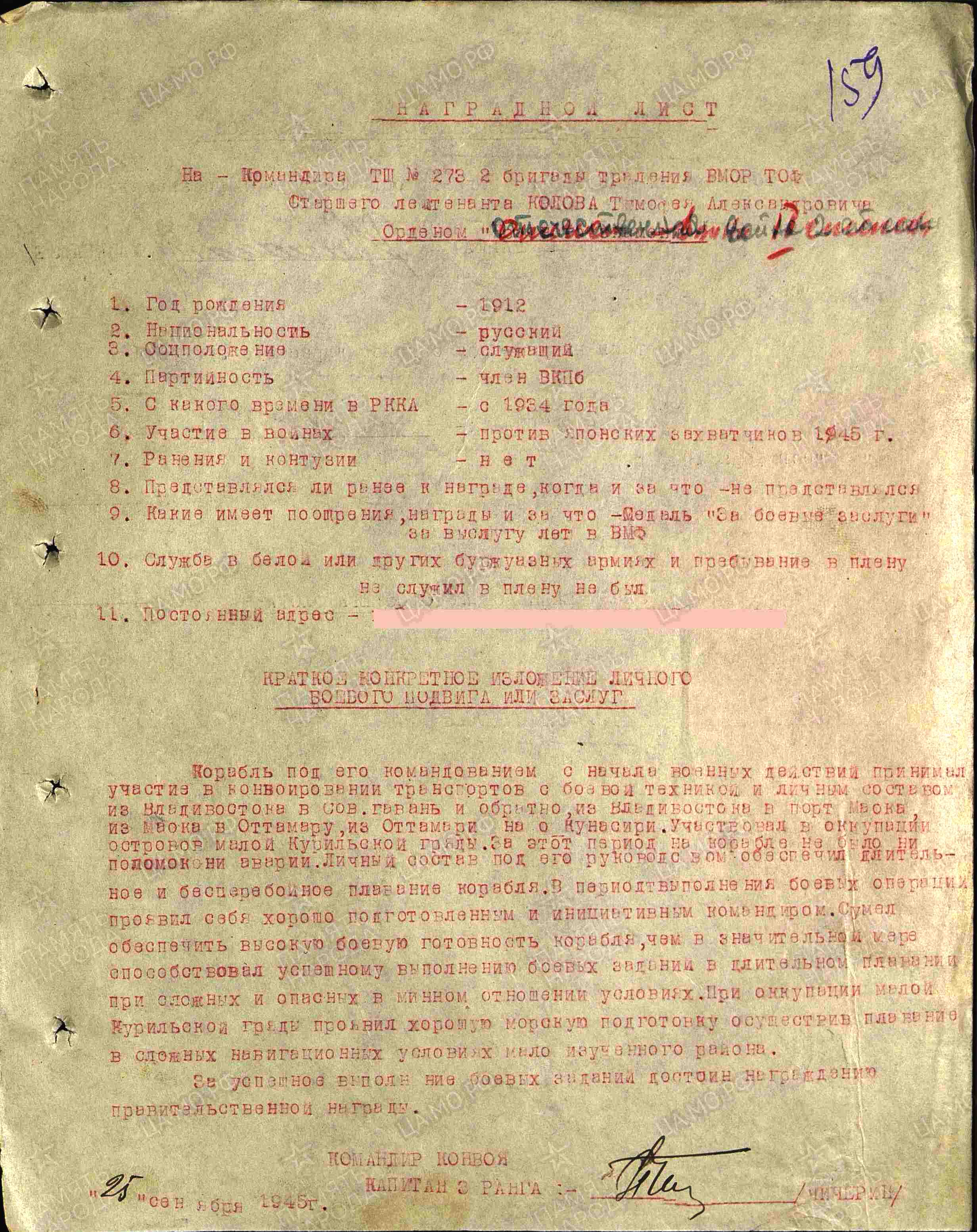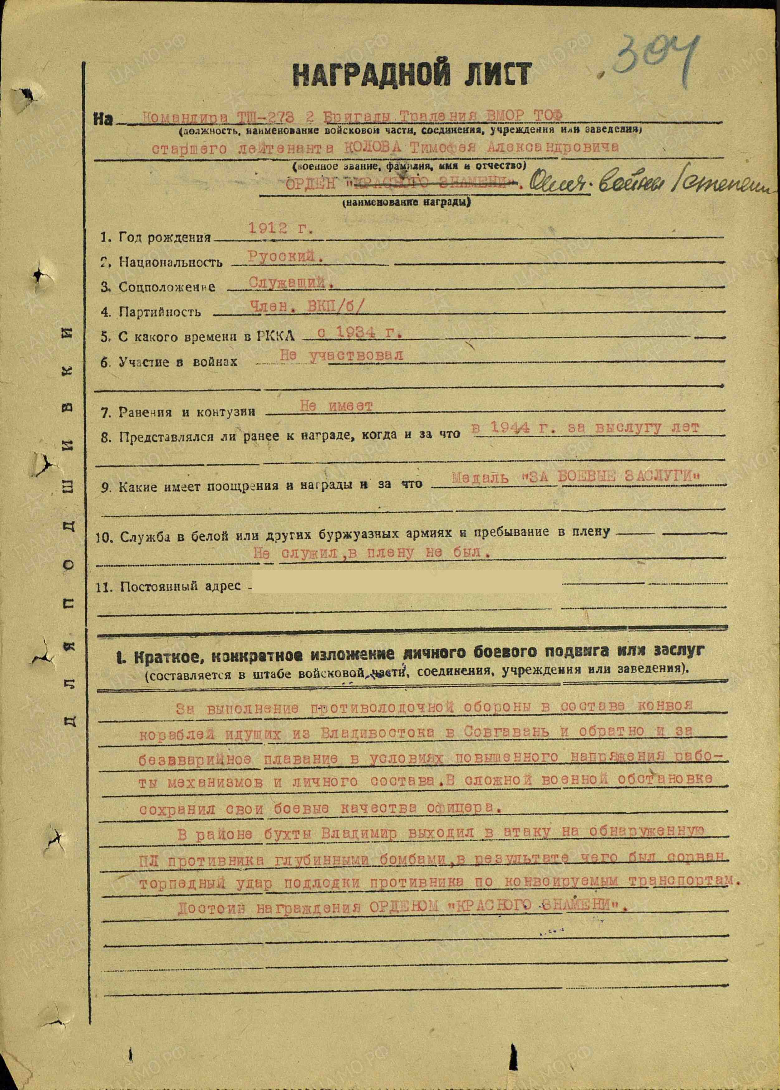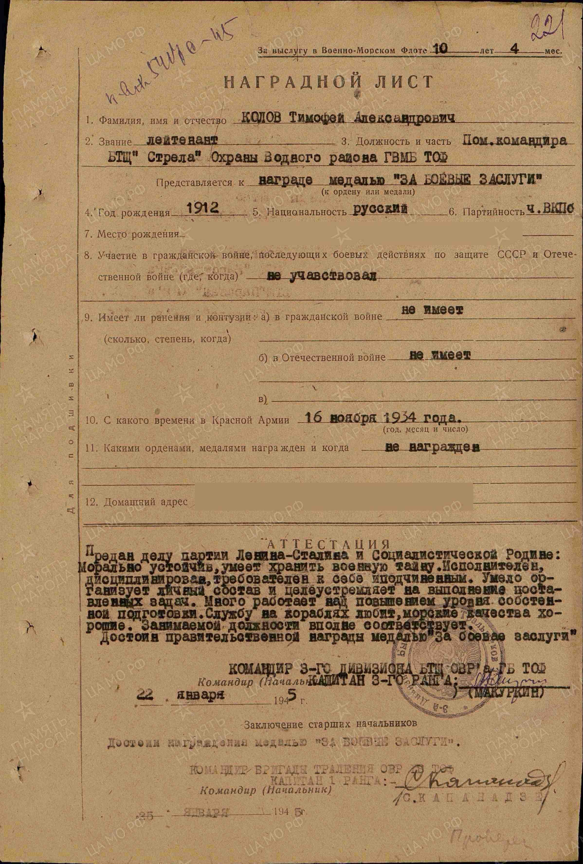 КОЛОВ Тимофей Яковлевич, 1912, д. Ямкино. Призван в РККФ 16 нояб. 1934. Служил на Дальнем Востоке. Лейтенант/ ст. лейтенант/ капитан 3 ранга/ капитан 2 ранга. Член ВКП(б). Пом. ком. базового тральщика «Стрела» Главной военно-морской базы ТОФ, ком. тральщика № 273 2 Бригады траления Владивостокского морского оборонительного р-на, 5 отд. отряд 16 дивизиона тральщиков ТОФ. Участвовал в боевых действиях против Японии. Вышел в отставку в 1962. Награждён медалями «За победу над Японией», «За боевые заслуги», орденами Красной Звезды (1950), Отечественной войны 1 ст. (1945), двумя орденами Красного Знамени (1945, 1955), двумя орденами Отечественной войны 2 ст. (1945, 1985).