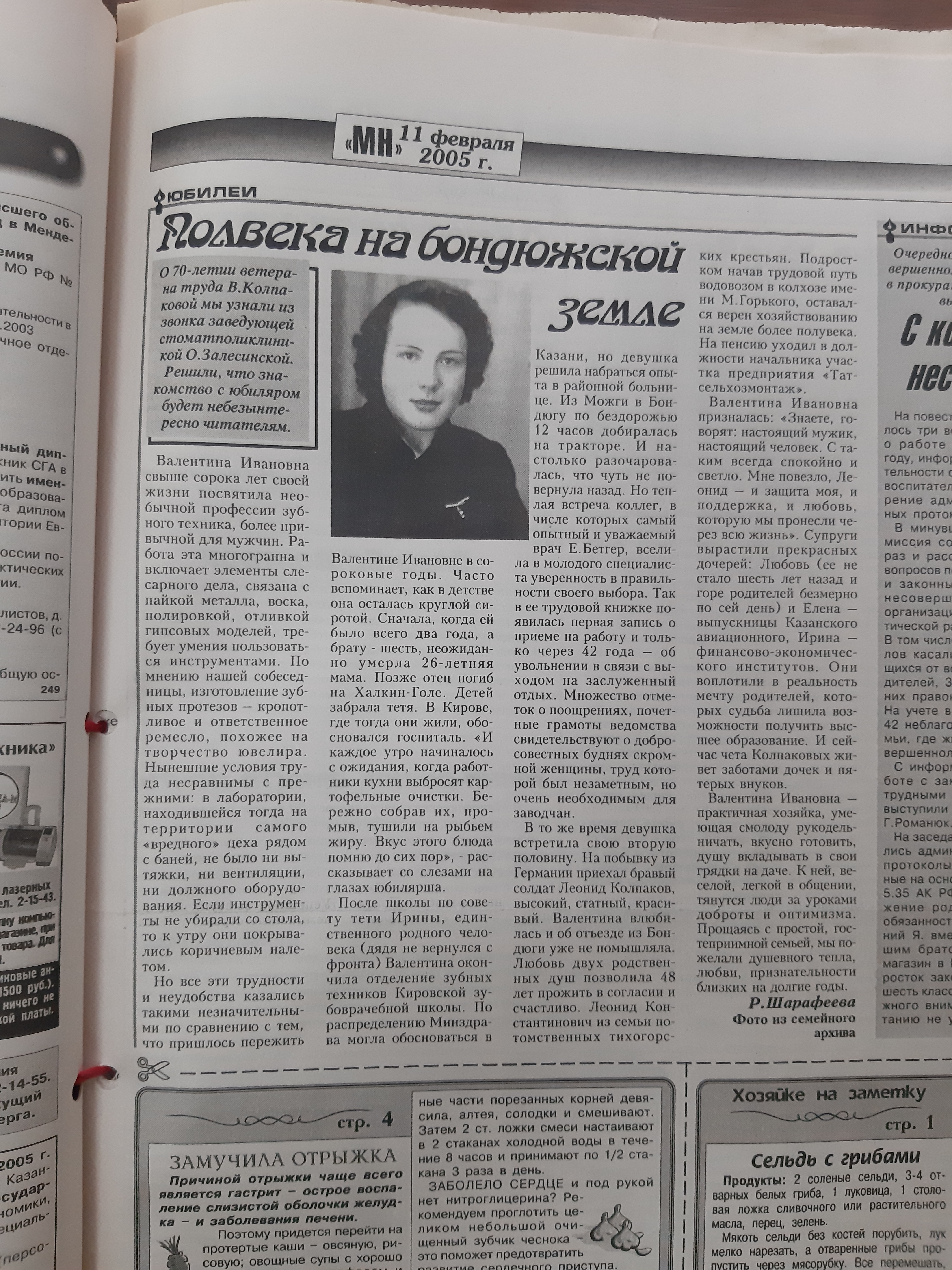 Получив профессию зубного техника, приехала в рабочий поселок Бондюжский по распределению. Вышла замуж, родились дочери. Валентина Ивановна освоила профессию и стала неотъемлемой частью стоматологической службы заводского поселка, население которого в связи со спецификой профессии остро нуждалось в качественной зуботехнической помощи. Этой профессии В.Колпакова посвятила всю свою жизнь и заслужила искреннее признание менделеевцев.