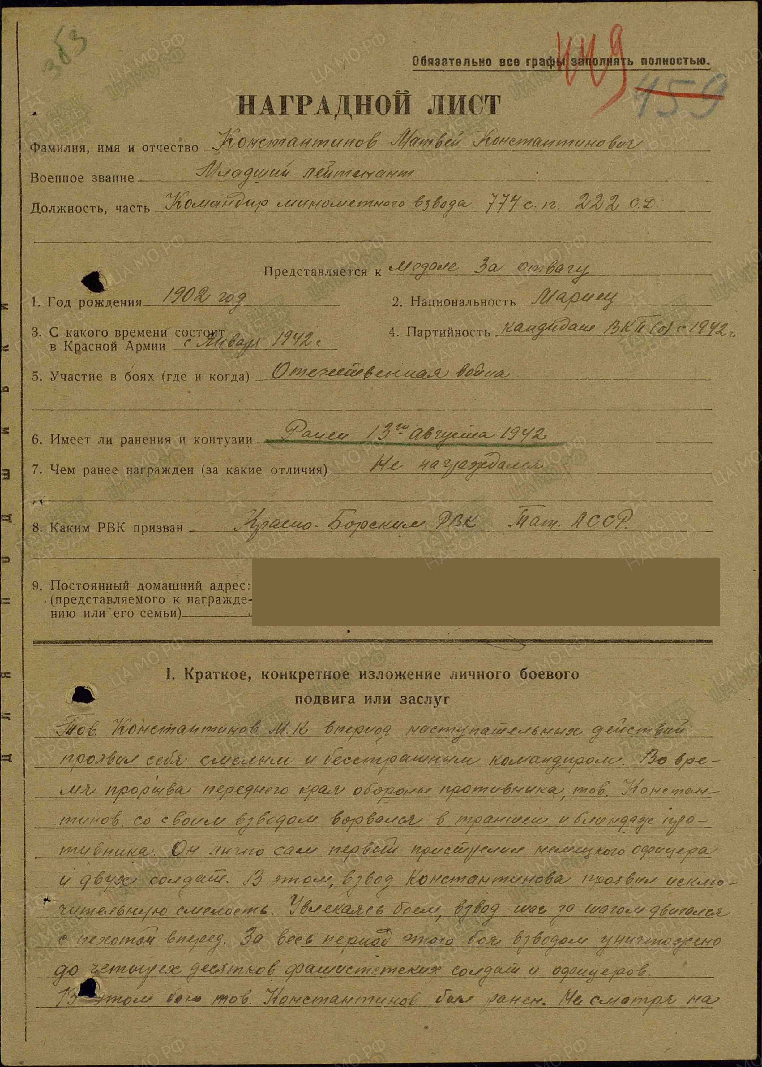 Был награжден медалью "За боевые заслуги".