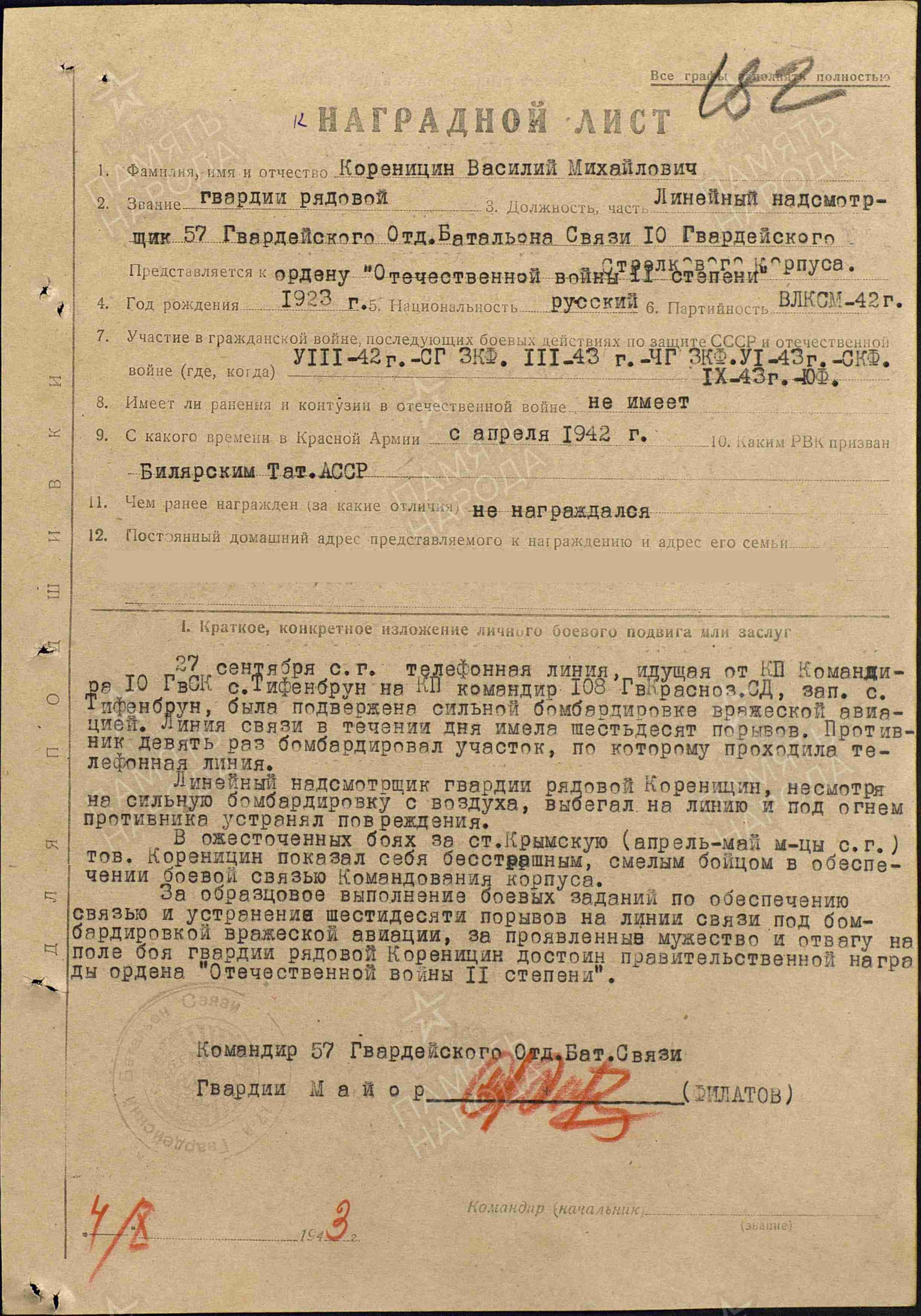 КОРЕНИЦЫН (КОРЕНИЦИН) Василий Михайлович, 1923, д. Николаевский Баран. До призыва в армию работал в к-зе «Волна Революции». Мобилизован Билярским РВК 8 марта/ 14 апр. 1942. Член ВЛКСМ. Воевал на Закавказском, Северо-Закавказском, Южном фронте в составе 44 А/ 9 А/ 56 А/ 18 А. Гв. красноармеец, линейный надсмотрщик 57 гв. отд. батальона связи 10 гв. СК. Перенёс тяжёлое ранение. После госпиталя служил на Центральной базе арт. вооружения № 41Глав. Арт. Управления. Награждён медалью «За оборону Кавказа», орденами Красной Звезды (1943), Отечественной войны 1 ст. (1985).