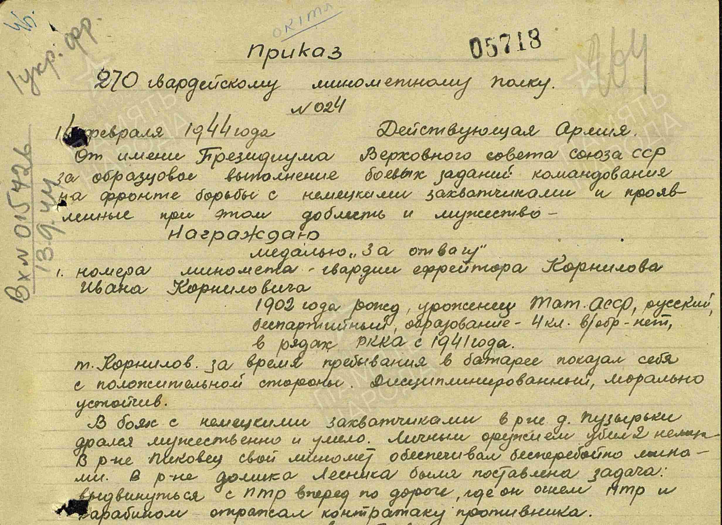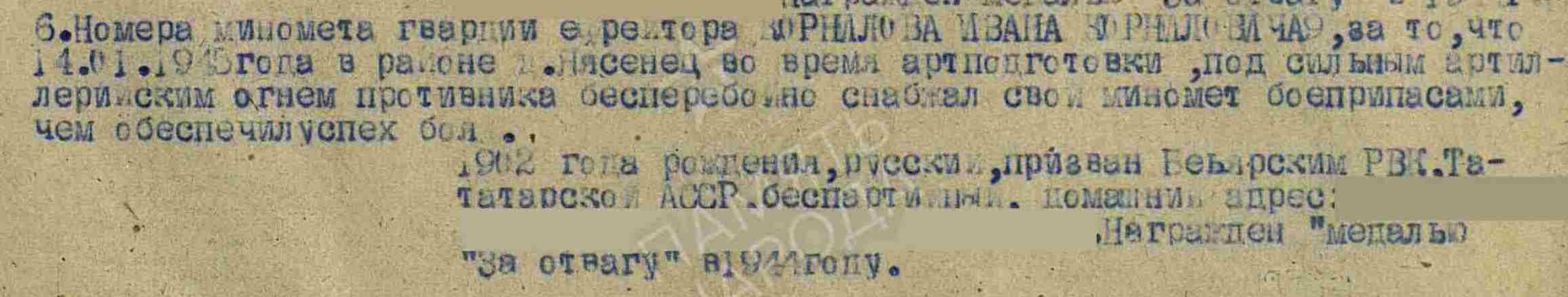 КОРНИЛОВ Иван Корнилович, 1902, д. Мордовская Багана, Чистопольский уезд. Мобилизован Билярским РВК в 1941. Воевал на Воронежском, 1 Украинском, 1 Белорусскрм фронте в составе 1 ТА/ 1 гв. ТА. Участник битвы на Курской дуге, освобождения Украины и Польши. Красноармеец/ гв. ефрейтор, орудийный номер миномёта 270 МинП/ 270 гв. МинП 6 ТК/ 11 гв. ТК. Награждён двумя медалями «За отвагу».