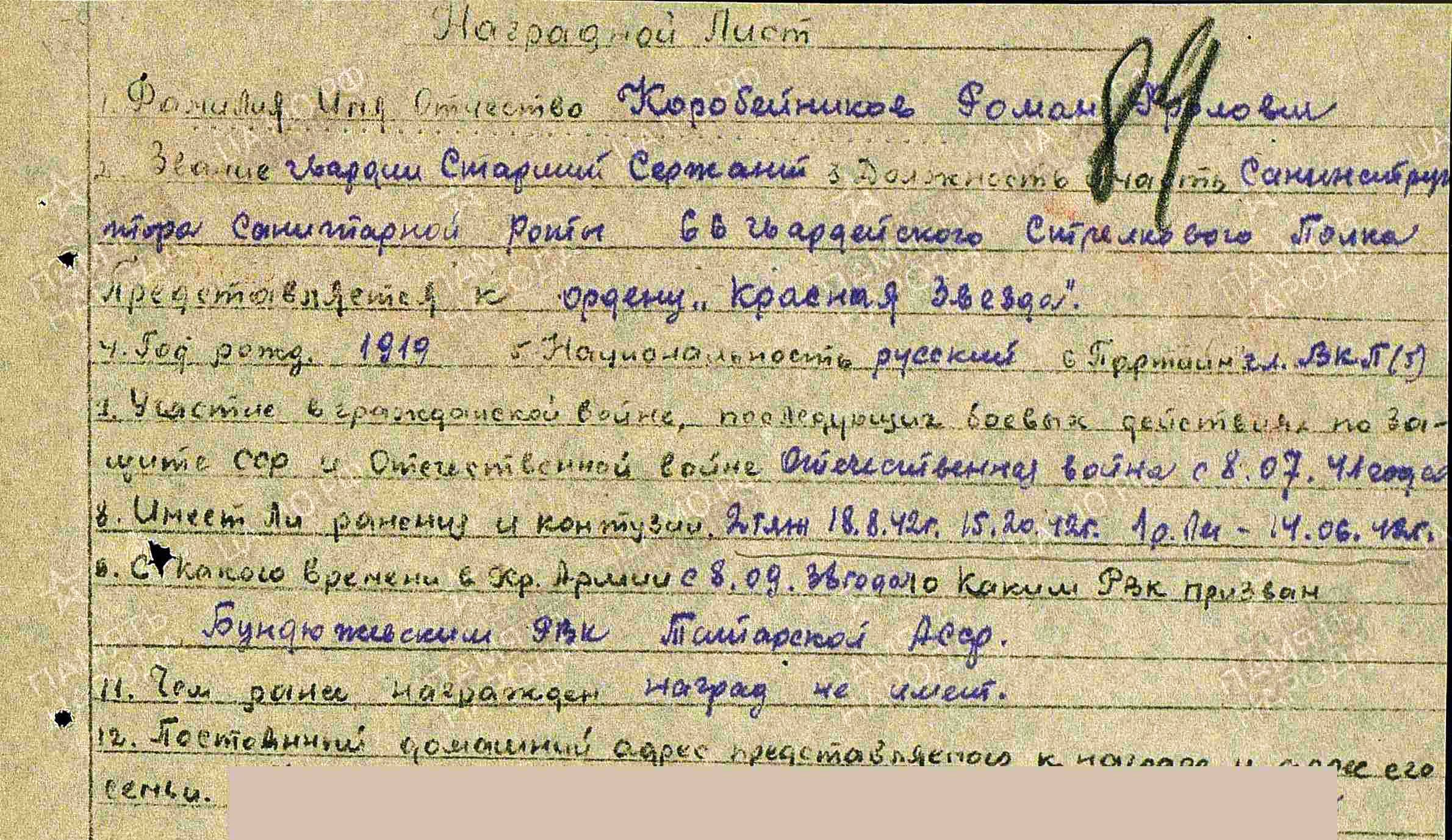 В РККА с 08.09.1938 года. Место призыва: Бондюжский РВК, Татарская АССР, Бондюжский р-н.